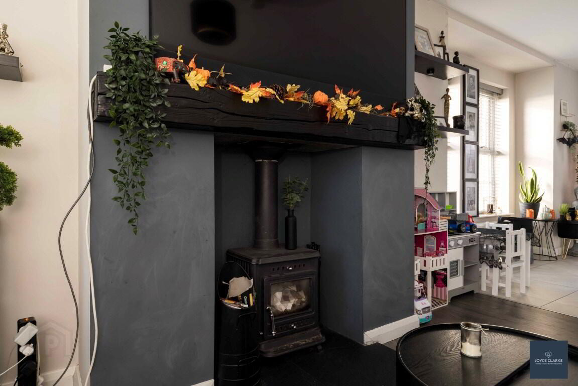 Front aspect reception room opening to kitchen diner. Feature fireplace with stove and slate tiled hearth and wood mantel. Low-level double panel radiator.