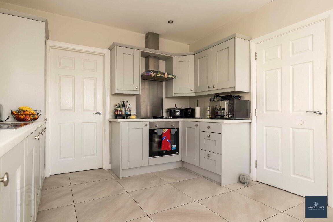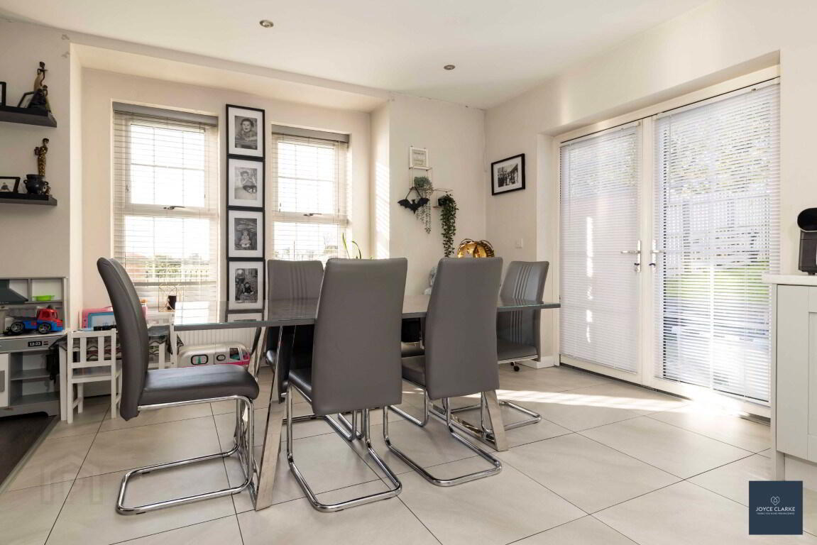 Bright and spacious triple aspect kitchen diner open to living room with feature bay window to side. Excellent range of kitchen cabinets. Appliances include electric oven and four ring electric hob with stainless steel extractor canopy above, integrated fridge freezer and dishwasher. Stainless steel sink and drainage unit. Tiled flooring. Double UPVC framed patio doors leading to rear garden. Low-level double panel radiators