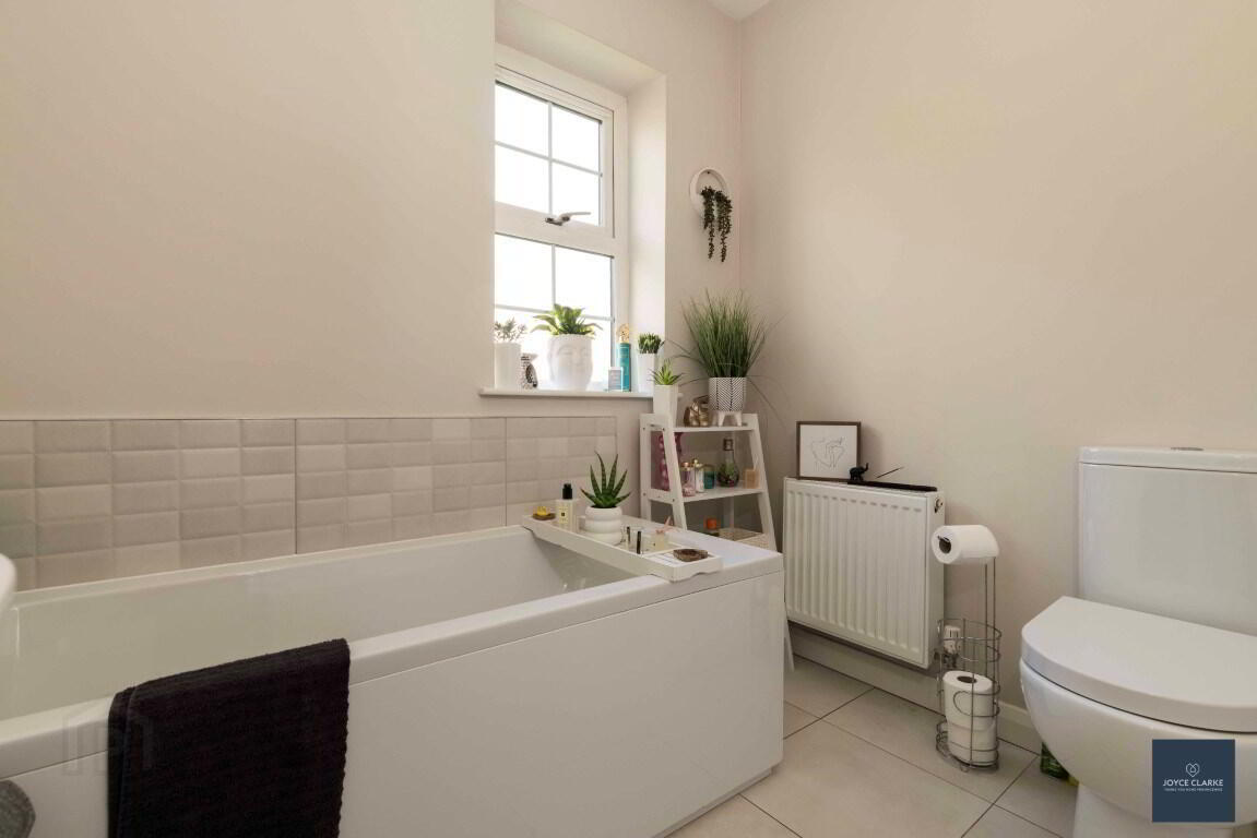 Four piece bathroom suite comprising of panel bath, dual flush WC, wash hand basin with pedestal and separate tiled shower enclosure with mains fed shower. Tiled flooring and splashback to wash hand basin and bath areas. Double panel radiator. Recessed lighting. Extractor fan.