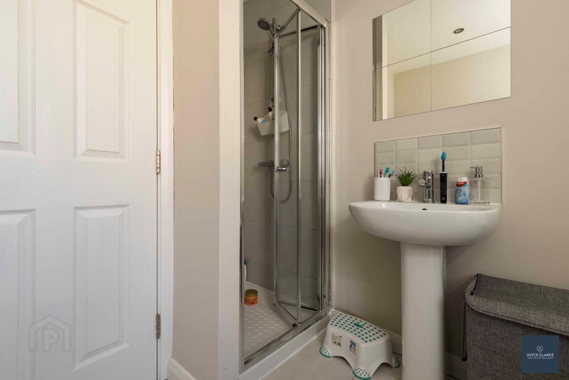 Tiled shower enclosure with mains fed shower. Dual flush WC and wash hand basin with pedestal. Single panel radiator. Tiled flooring and splashback. Extractor fan. Recessed lighting. Window providing natural light.