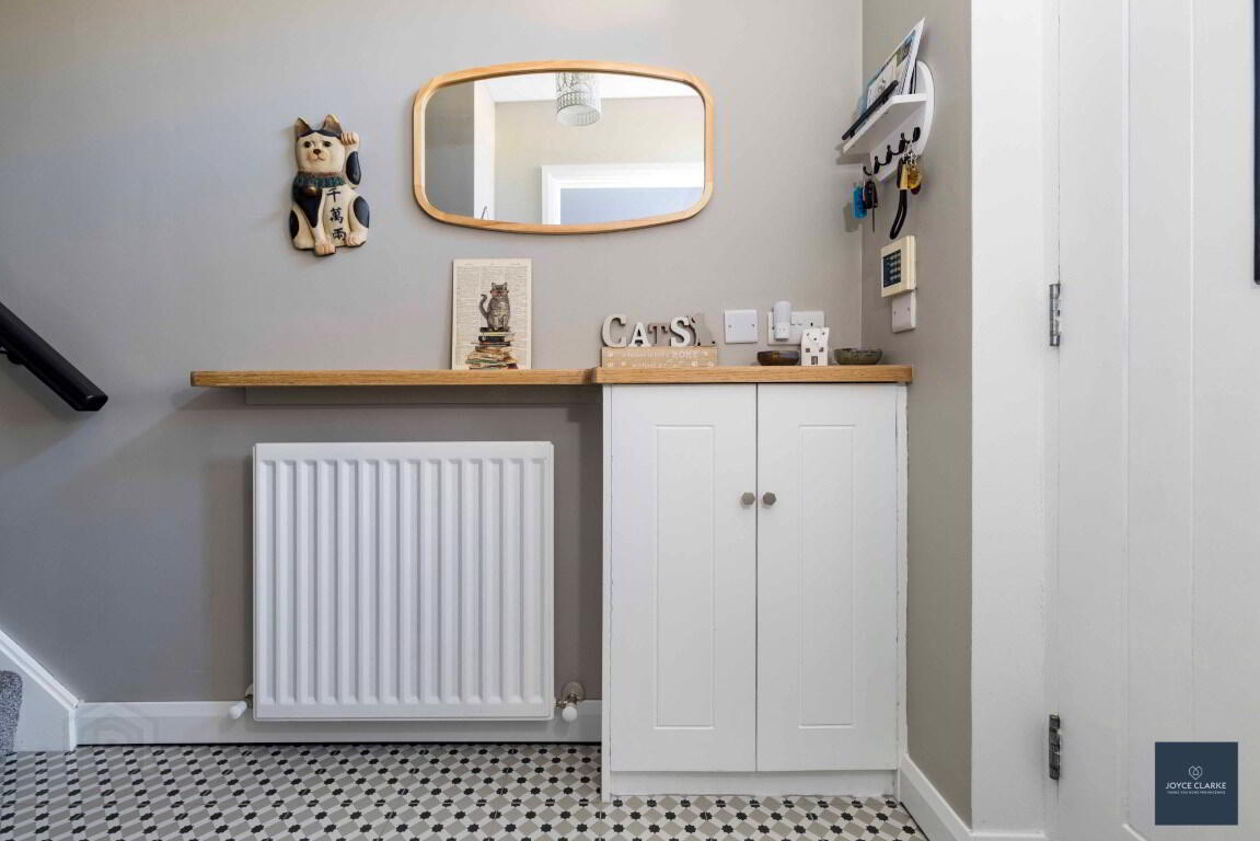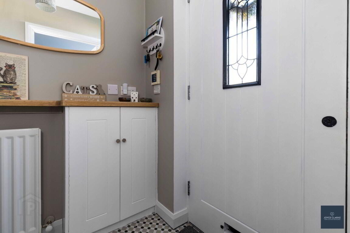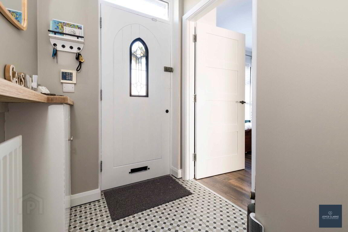 Solid wood entrance door with feature glazed panel. Tiled flooring. Single panel radiator. Alarm panel.
