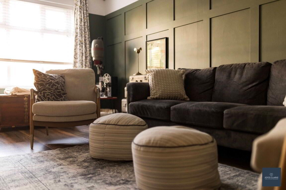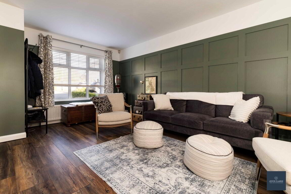 Front aspect reception room. Feature wall panelling. Built-in storage cupboard. Wood effect laminate flooring. Telephone point. Door with glazed panel leading to kitchen dining living.