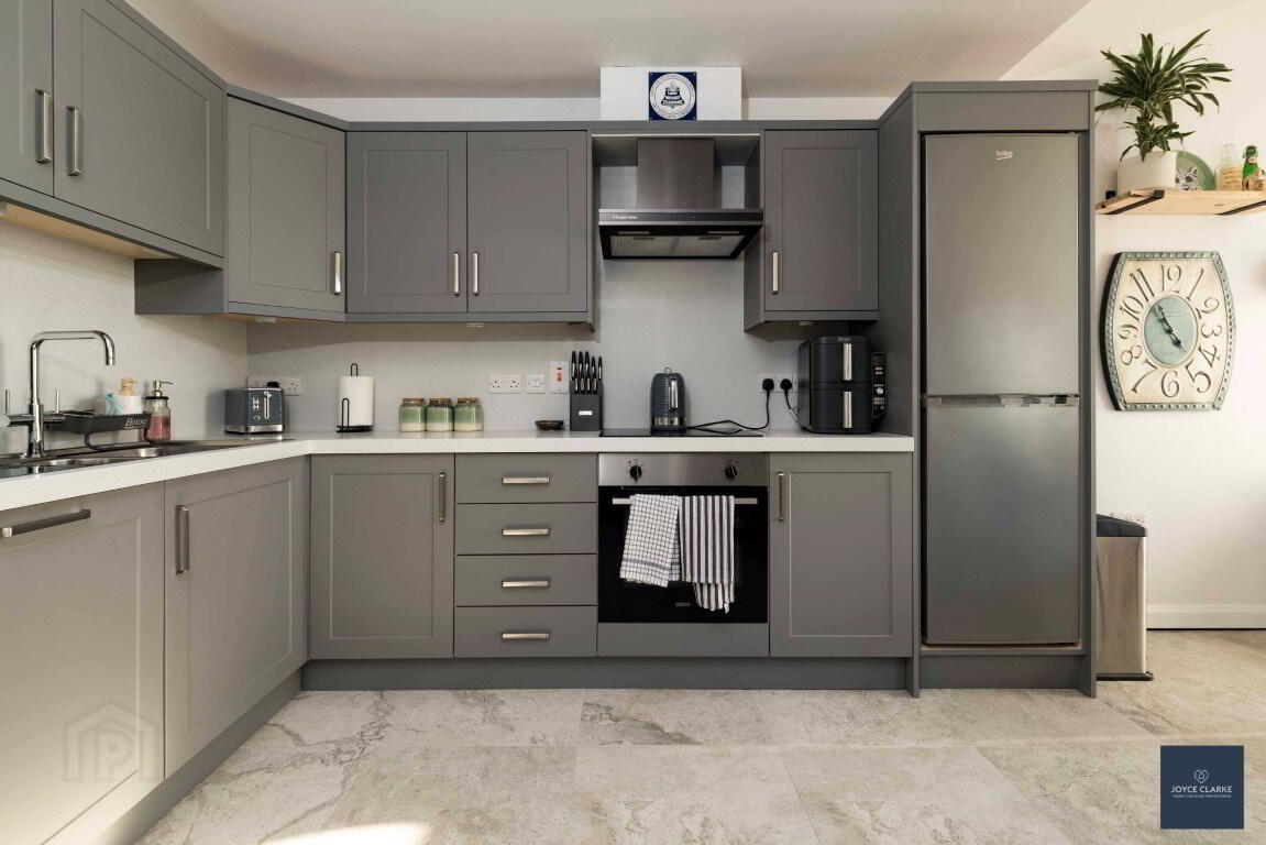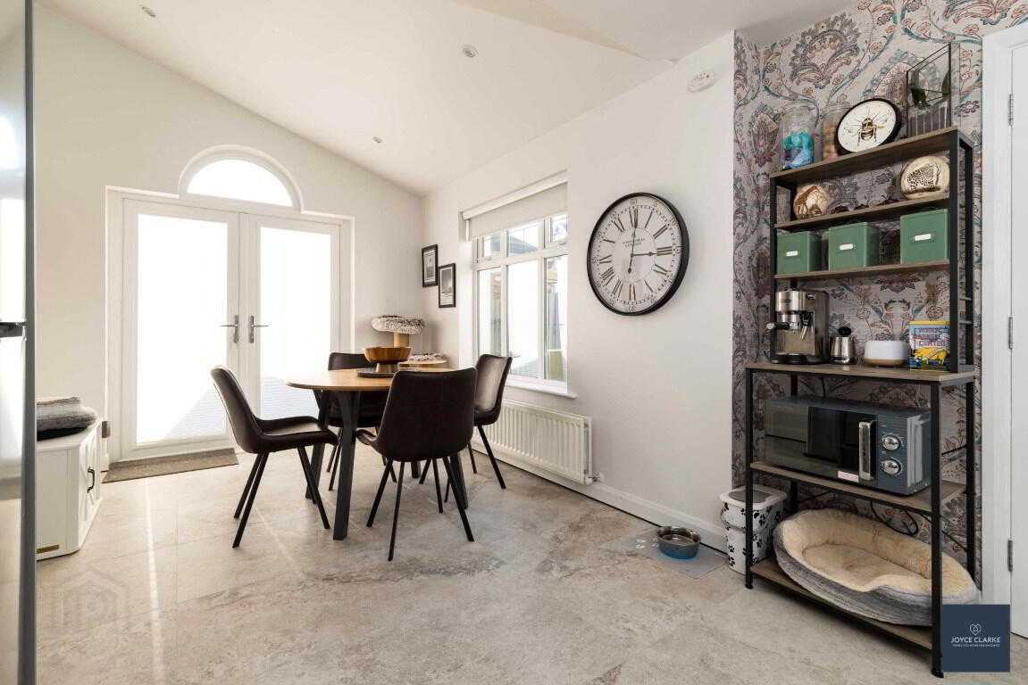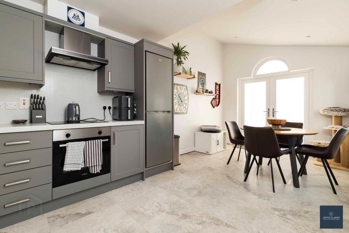 Range of high and low level refurbished kitchen cabinets including new doors, lazy Susan corner unit and Quartz worktop overlay and splashback. Range of appliances include new electric oven, four ring electric hob with stainless steel extractor canopy above and integrated dishwasher. Space for fridge freezer stainless steel one and half bowl sink and drainage unit. Tiled flooring. Two double panel radiator. Shed ceiling to living area with double patio doors leading to rear garden. Recessed lighting.