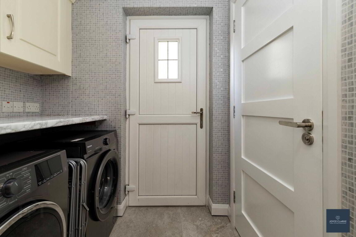 High level kitchen cabinets. Worktop space. Space for washing machine and tumble dryer. Extractor fan. Tiled flooring. UPVC door with glazed panel giving access to side.
