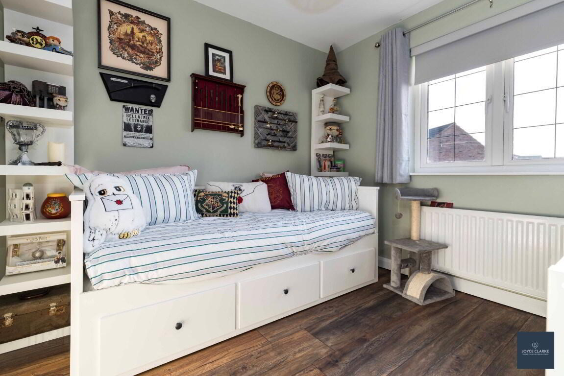 Side aspect bedroom. Wood effect laminate flooring. Single panel radiator. Wall plate for wall mounted TV.