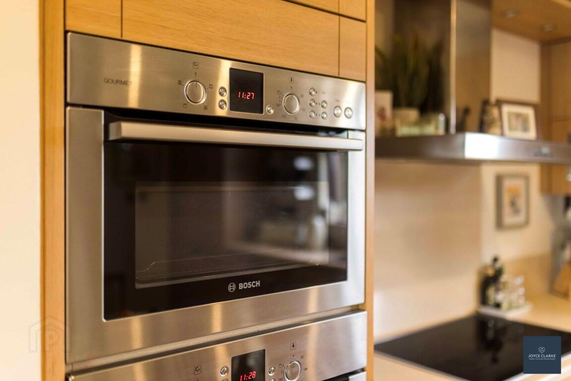 Dual aspect kitchen dining living room, ideal for modern family living. Excellent range of kitchen cabinets by Design House with soft close solid Oak doors and includes saucepan drawers, pull out larder unit and lazy Susan corner unit. Impressive range of appliances include double eye level Bosch ovens, four ring Bosch electric hob with stainless steel extractor canopy above, integrated Bosch dishwasher and full height integrated fridge. Quartz worktops and upstands with underfitted stainless stainless double bowl sink with mixer tap and additional jet spray. Walk-in shelved pantry (1.80m x 1.37m). Tiled flooring to kitchen area. Two double panel radiators. Brick inglenook fireplace with stove.