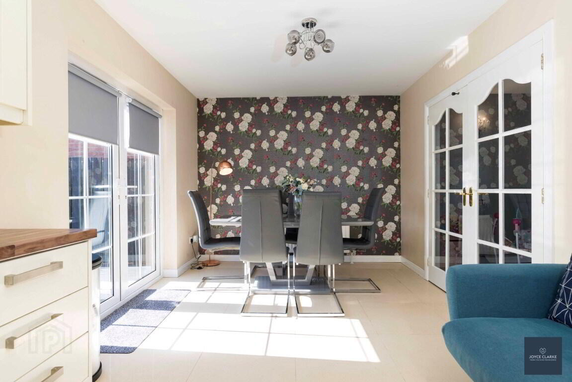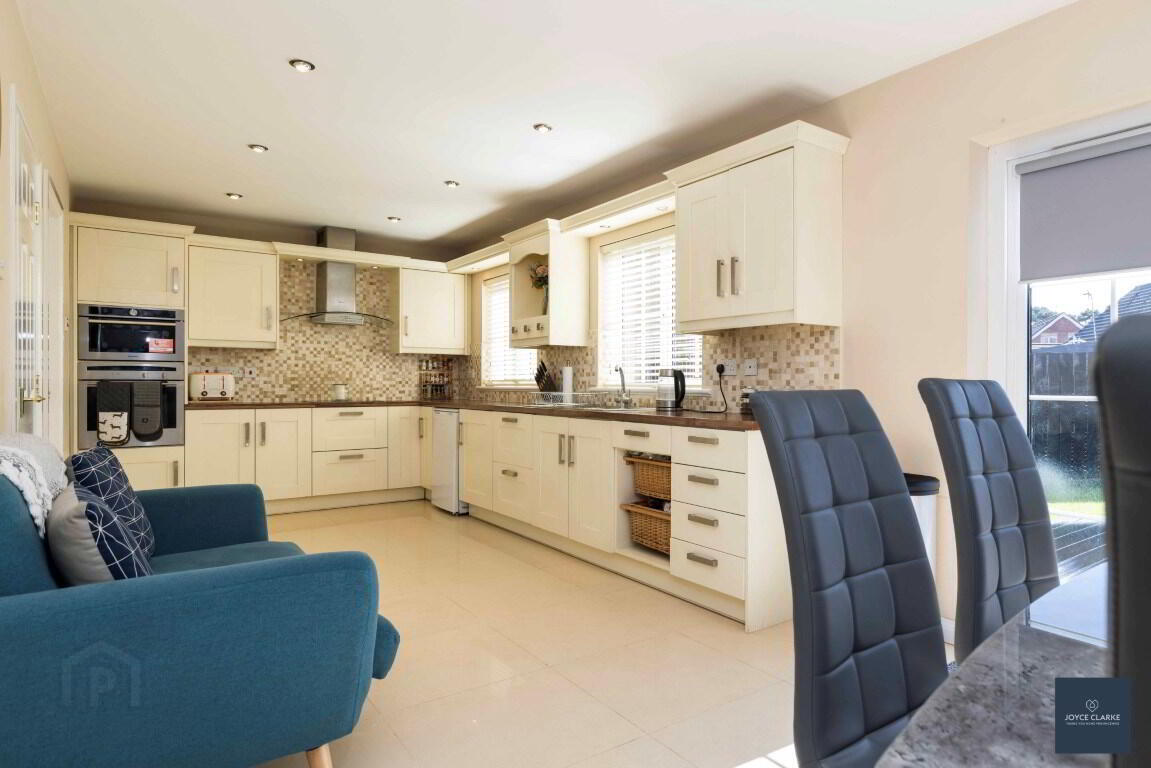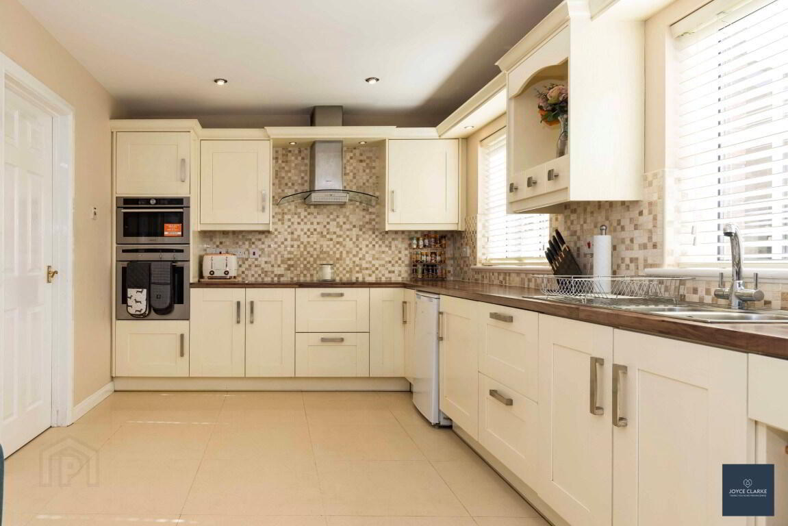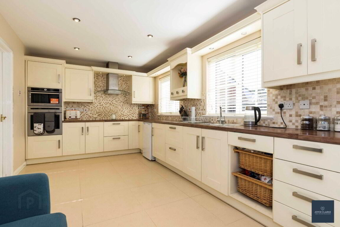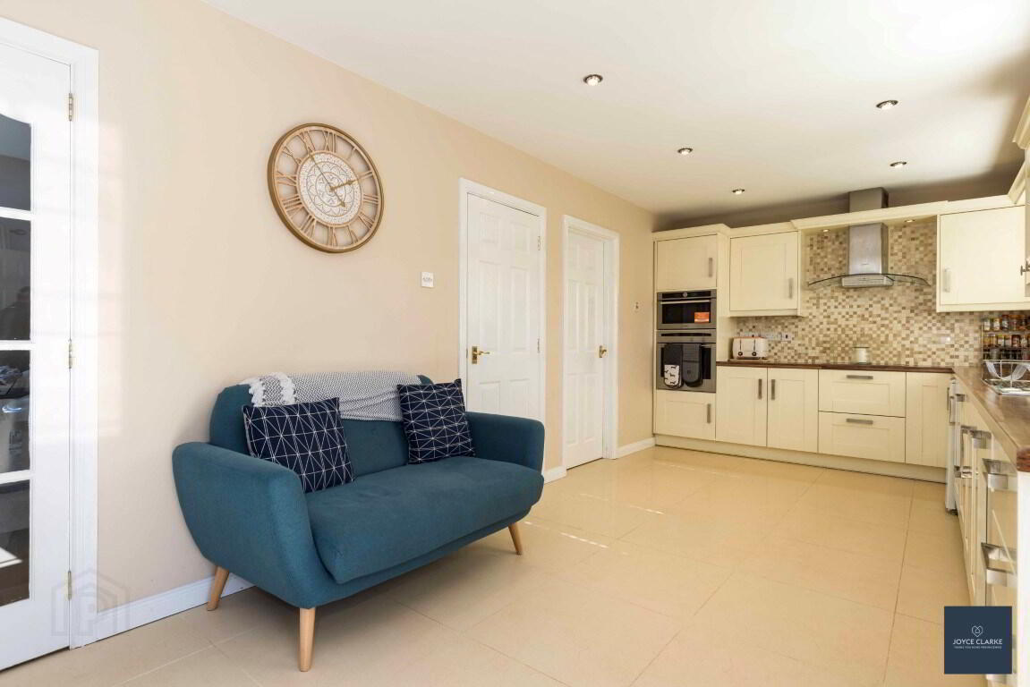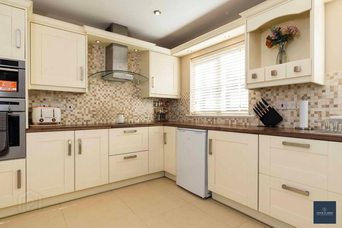 Extensive range of high and low level units with integrated appliances to include fridge, dishwasher, microwave, built in NEFF eye line oven & hob with stainless steel and glass extractor, dishwasher Pelmet over sink and hob with down lighters. Butchers block effect work top. Tiled floor and splash back. Double patio doors to garden. Recessed lighting. Double panel radiator.