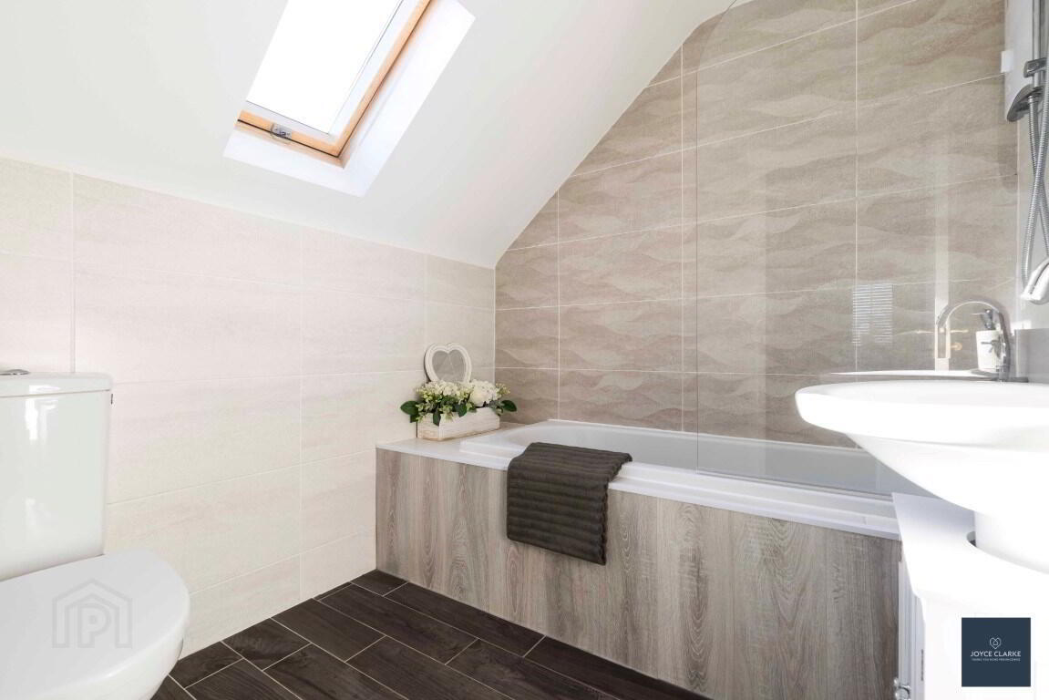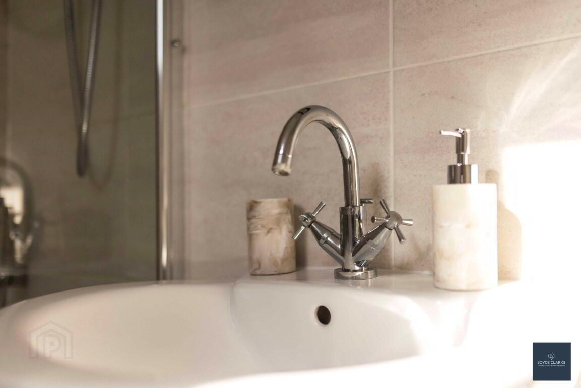 Three piece suite comprising of dual flush WC, pedestal sink, bath with Mira Sport shower over. Tiled floor and part tiled walls. Recessed lighting. Extractor.