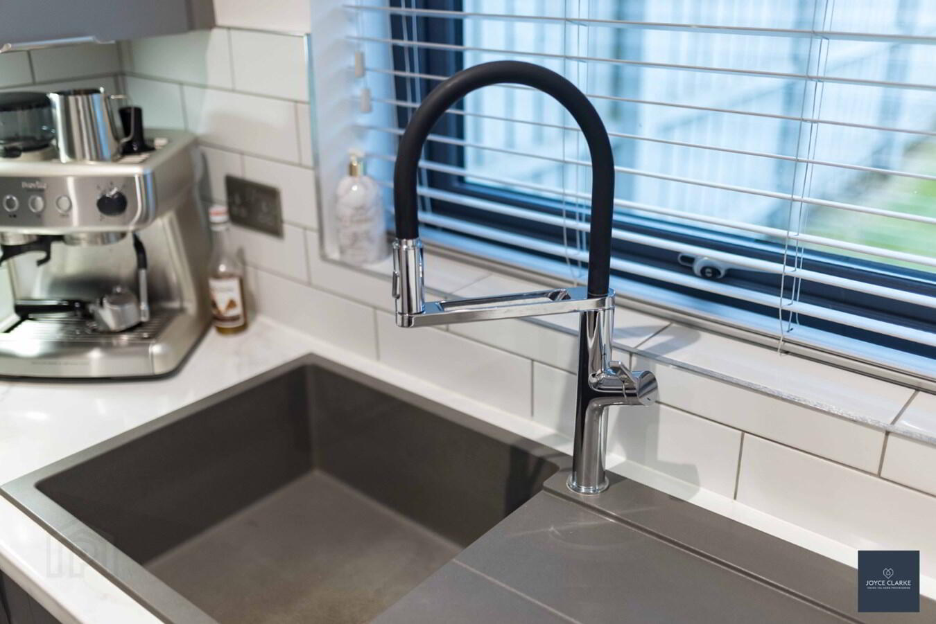Beautifully designed contemporary kitchen with a range of high and low level units and breakfast bar. Integrated appliances to include eye level NORDMENDE oven, NORDMENDE dish washer, four ring gas hob with stainless steel extractor over. Composite sink and drainer with mixer tap. Attractive wall panelling. Patio doors to rear. Recessed lighting. Double panel radiator.
