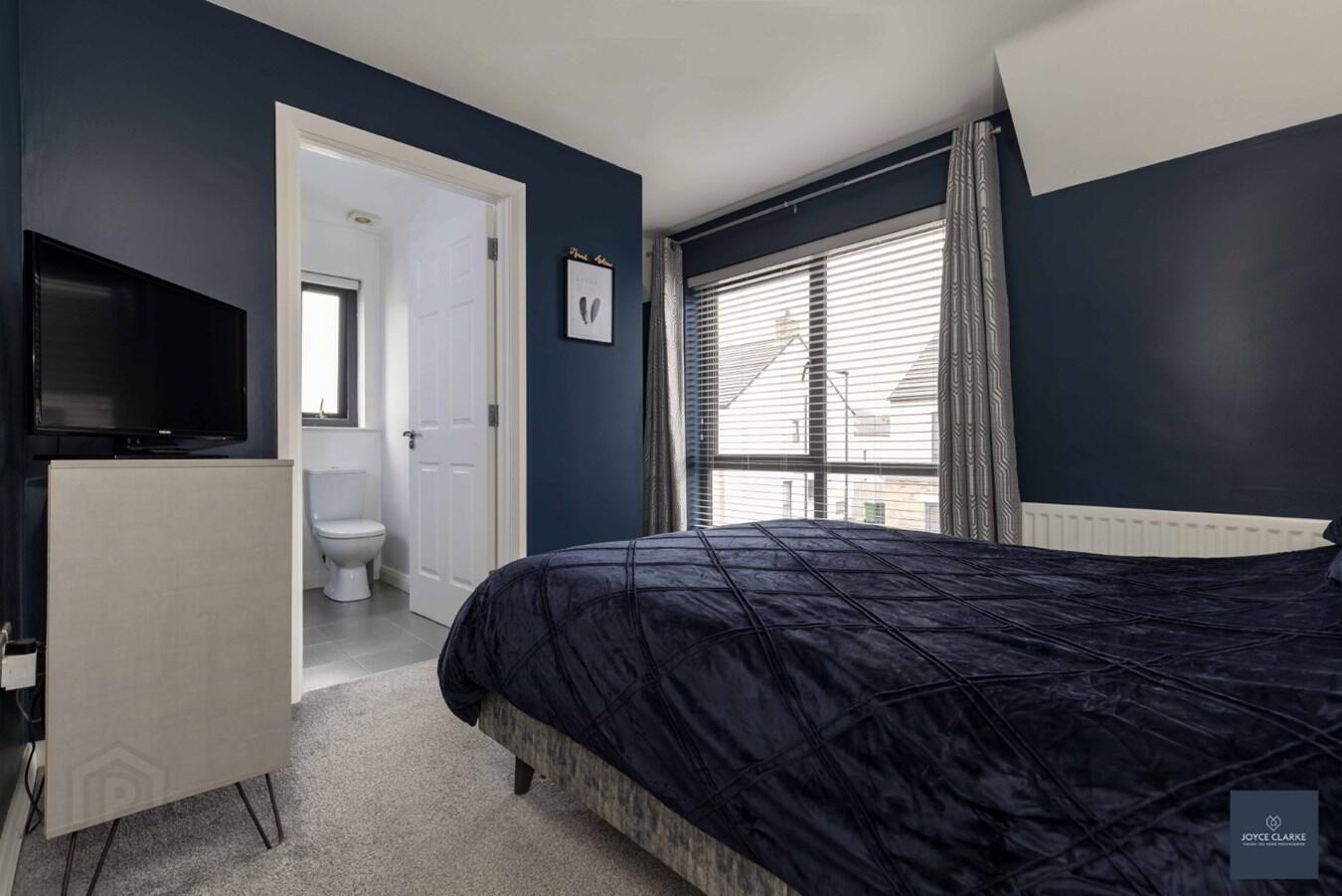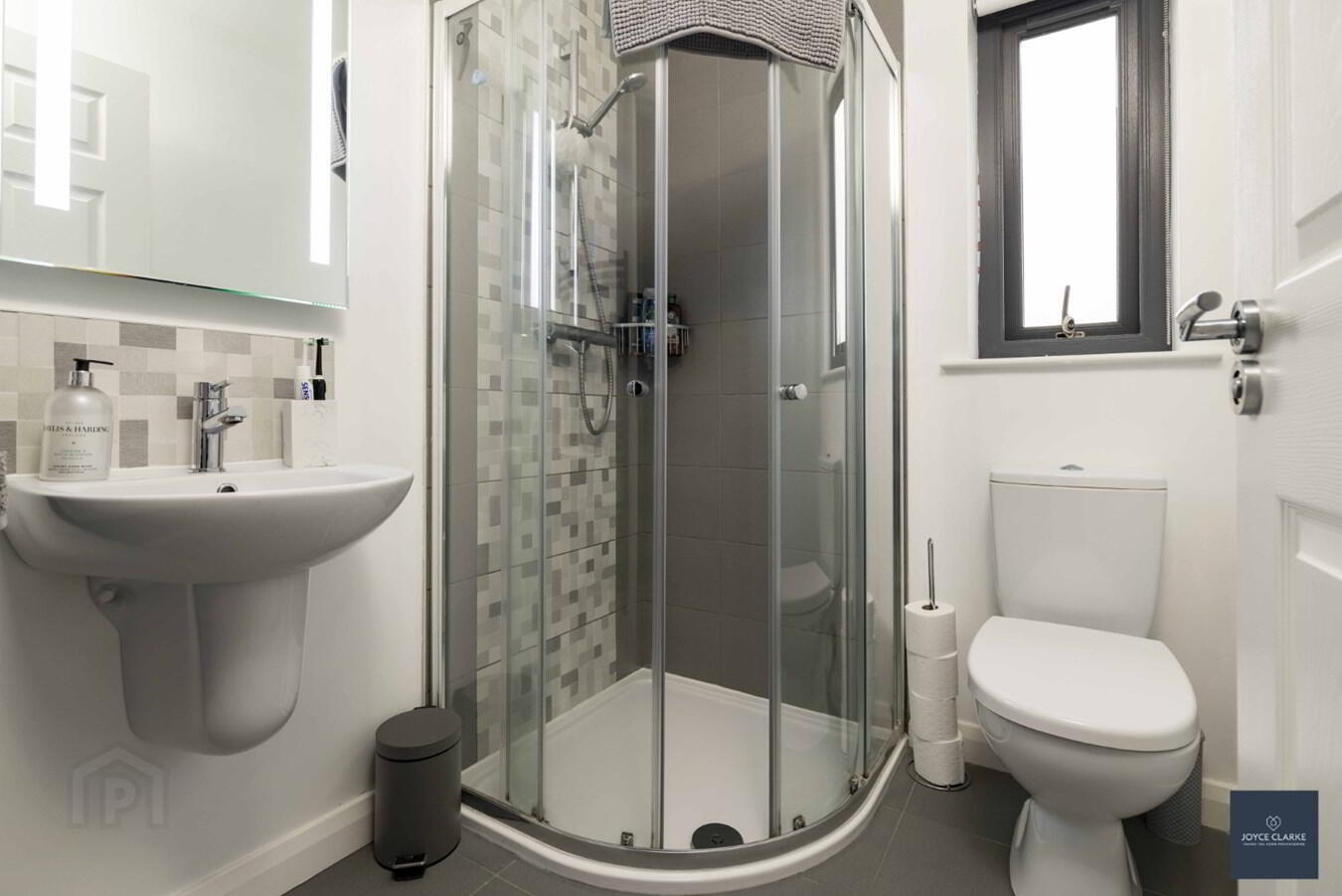 Corner shower enclosure with mains fed shower. Floating sink with mixer tap. Back to wall dual flush WC. Heated towel rail. Tiled floor and part tiled walls. Window. Extractor. Recessed lighting.