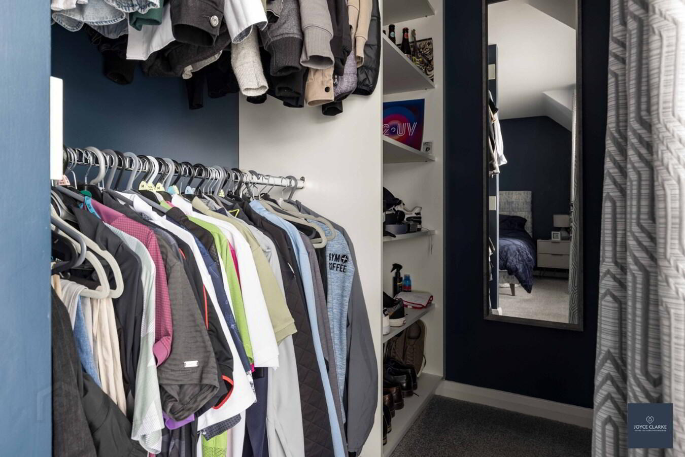 Range of bespoke fitted storage and shelving. Single panel radiator.