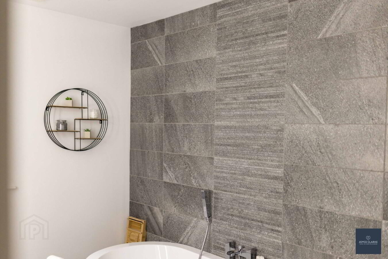 Modern suite comprising of free standing bath with centre taps and shower attachment. Floating sink with mixer tap. Back to wall dual flush WC. Heated towel rail. Tiled floor, splash back and feature wall. Recessed lighting. Window. Extractor.