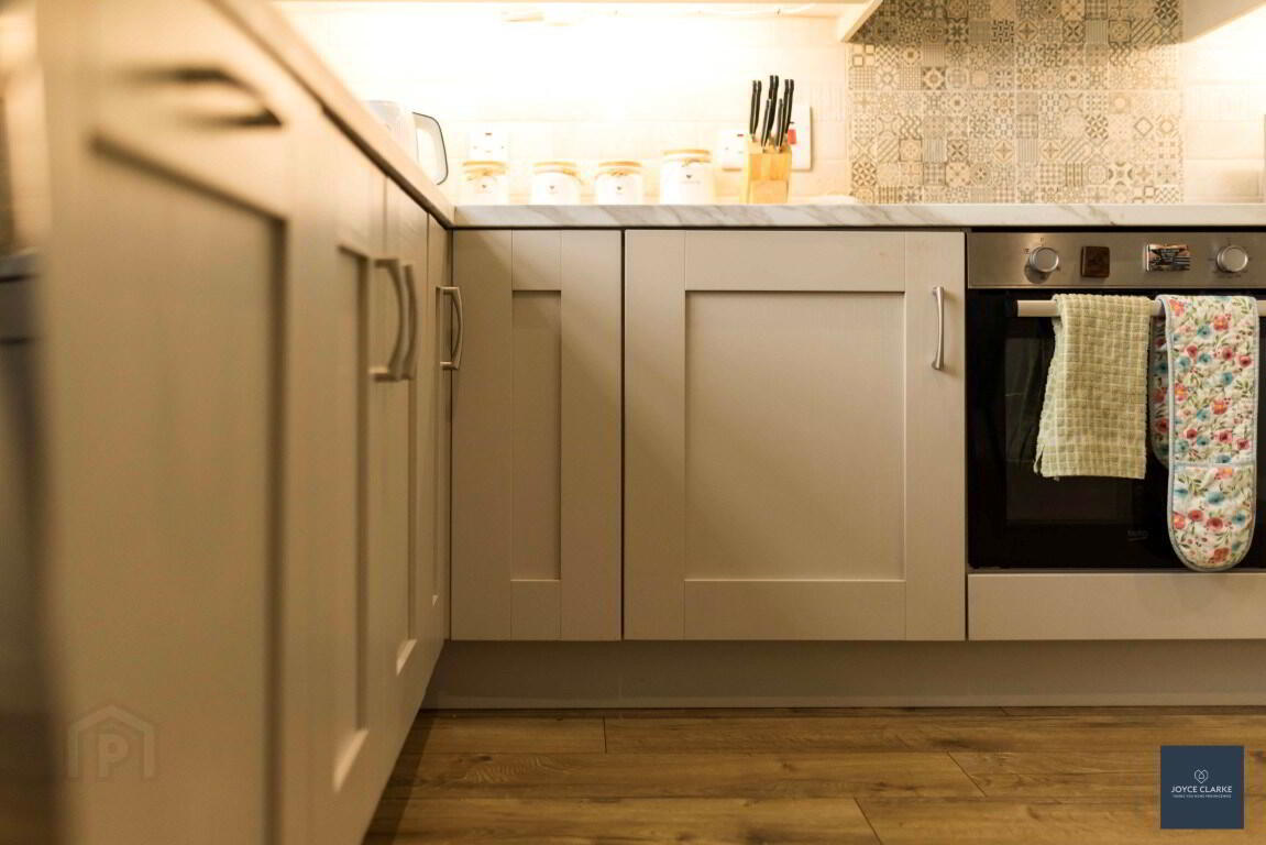 Excellent range of high and low level kitchen cabinets including under unit lighting. Range of appliances include electric oven, four ring electric hob with extractor fan and glass canopy above, integrated fridge freezer and dishwasher. Space for washing machine. Stainless steel sink and drainage unit with mixer tap. Double patio doors leading to rear garden. TV point. Recessed lighting to kitchen area. Wood effect laminate flooring. Double panel radiator
