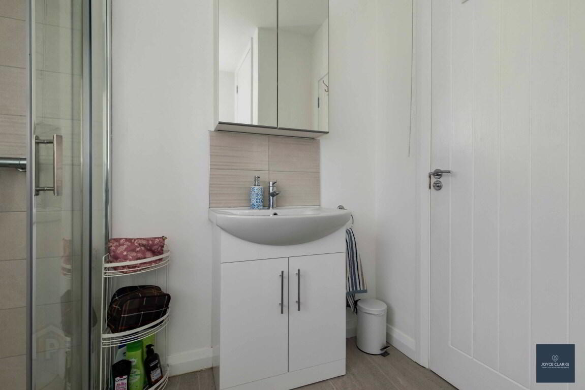 Four piece bathroom suite comprising of corner bath with centre taps, back to wall dual flush WC, wash hand basin with vanity unit below and tiled shower quadrant with mains fed shower. Tiled flooring and splashback to bath and wash hand basin. Built-in storage cupboard. Single panel radiator. Extractor fan.