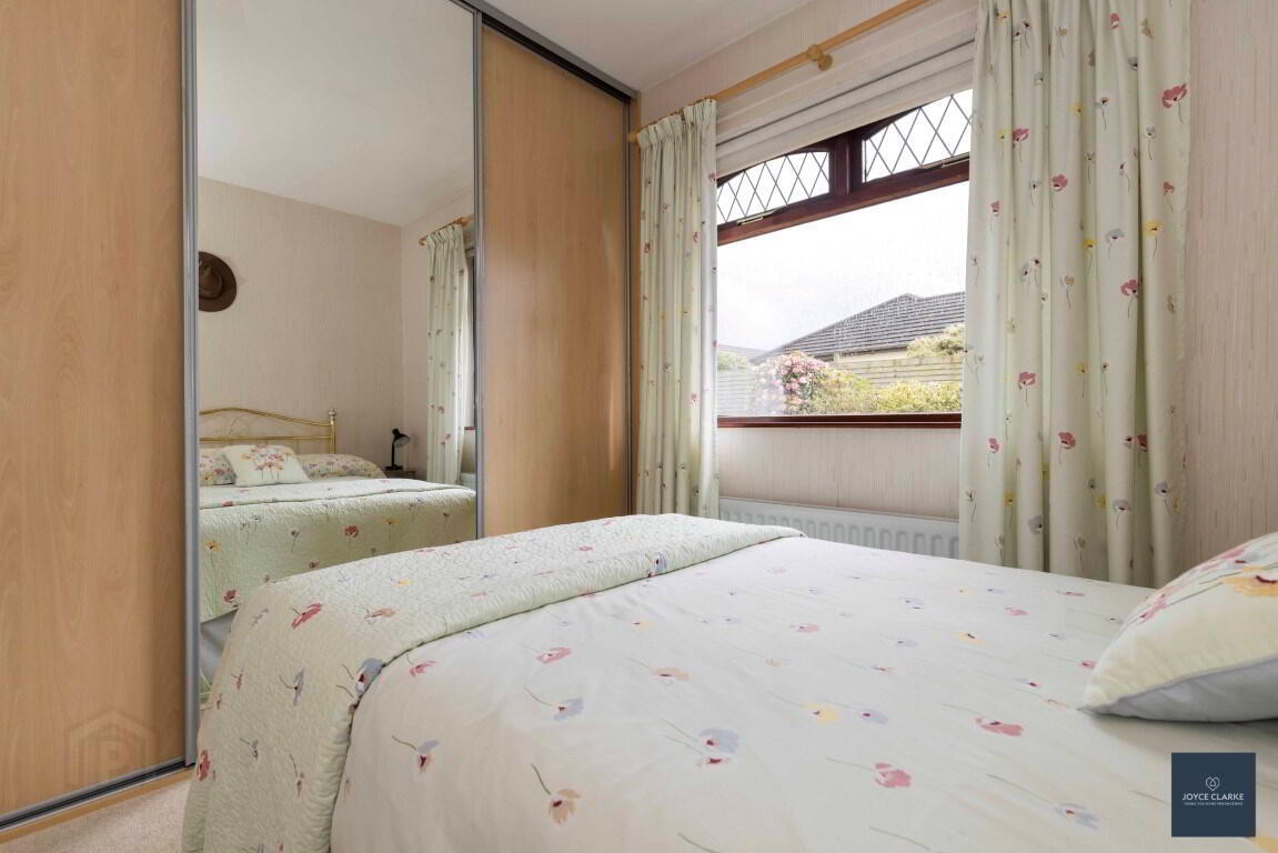 Rear aspect double bedroom. Fitted three door slide wardrobe with range of clothes rails, shelving and drawers. Double panel radiator.