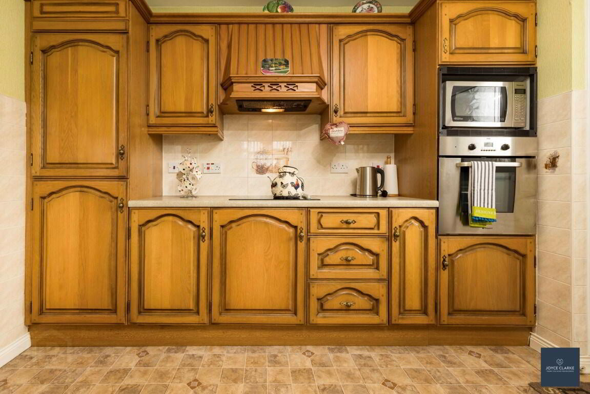 Range of high and low level kitchen cabinets with solid wood doors, under unit lighting and display cabinets with glazed panels and lighting. Range of appliances include electric oven, four ring electric hob and integrated fridge freezer. Stainless steel one and half bowl sink and drainage unit. Tiled splashback and tile effect vinyl flooring. Double panel radiator. UPVC door with glazed panel giving access to side of property