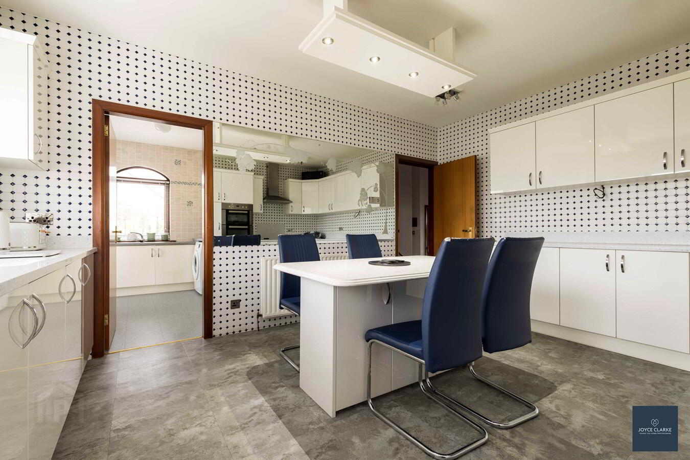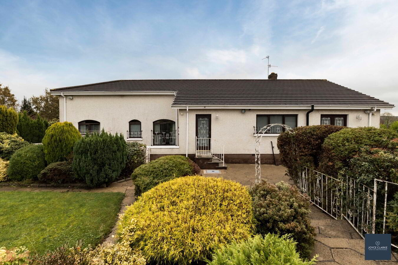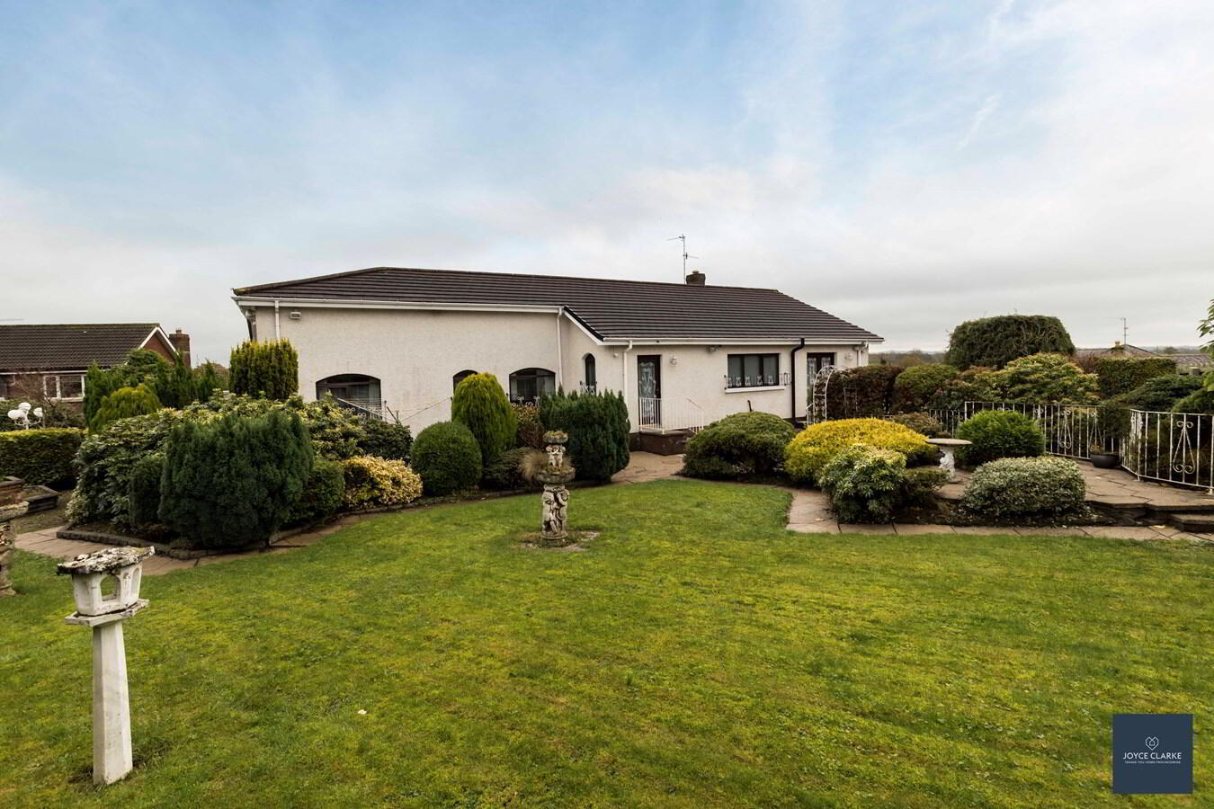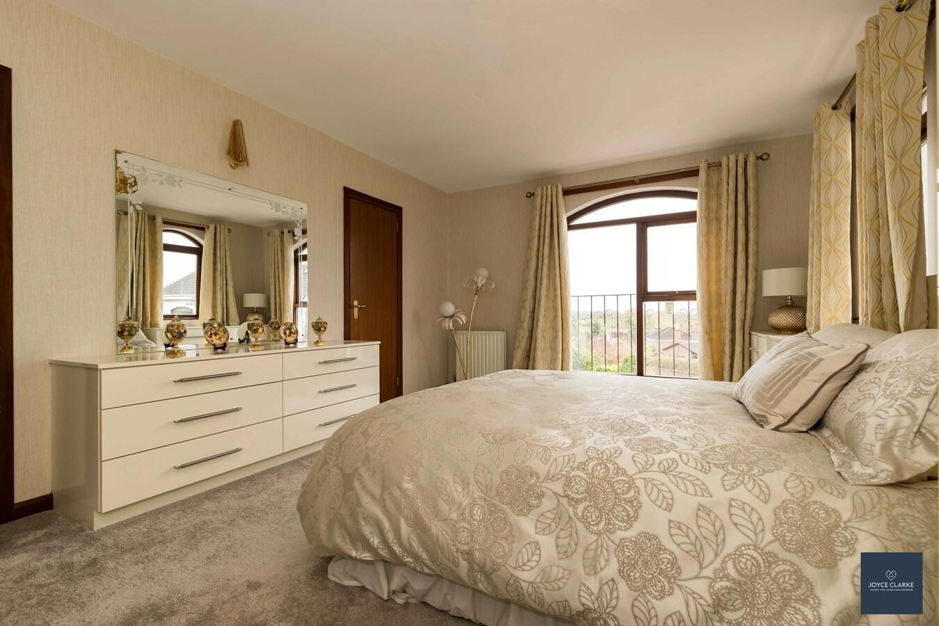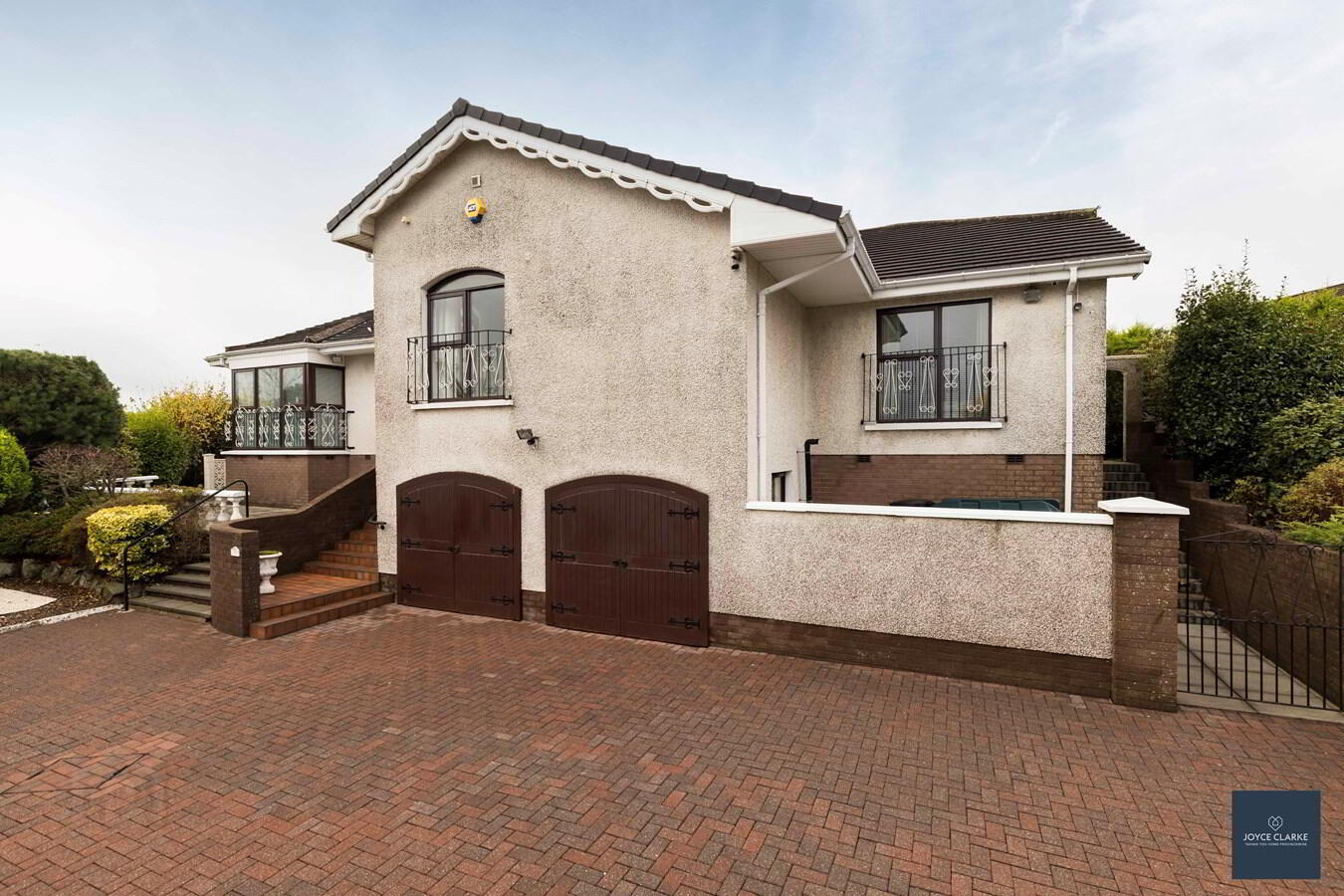 2 Drumclogher Park is a truly impressive detached family home, set upon an elevated large site within a sought after development that rarely has any properties for sale! There is a sweeping driveway with attractive paving leading up this property, offering excellent parking within it's gated entrance. Step inside and you cannot fail to be impressed with the grand reception room. This bright and spacious dual aspect lounge has a feature marble fireplace, with steps leading to a raised dining room ideal for entertaining. The kitchen is the heart of every home, and this one is bang up to date with a range of modern gloss high and low level units complimented by a contrasting island and an array of integrated appliances. This is a real family home that has been well maintained over the years. It offers four double bedrooms all of which have built in wardrobes. The master suite is a wonderful room with a full range of well designed built in furniture, en suite, and walk in wardrobe. A utility room and WC complete this property internally. There is a double garage with clear span internal space, power and light. One of the true strengths of this property is the wonderful gardens that wrap around it. Each section has been well thought out with individual patio areas and beautiful lawn surrounded by mature plants and trees. Viewing is by appointment only through Joyce Clarke.