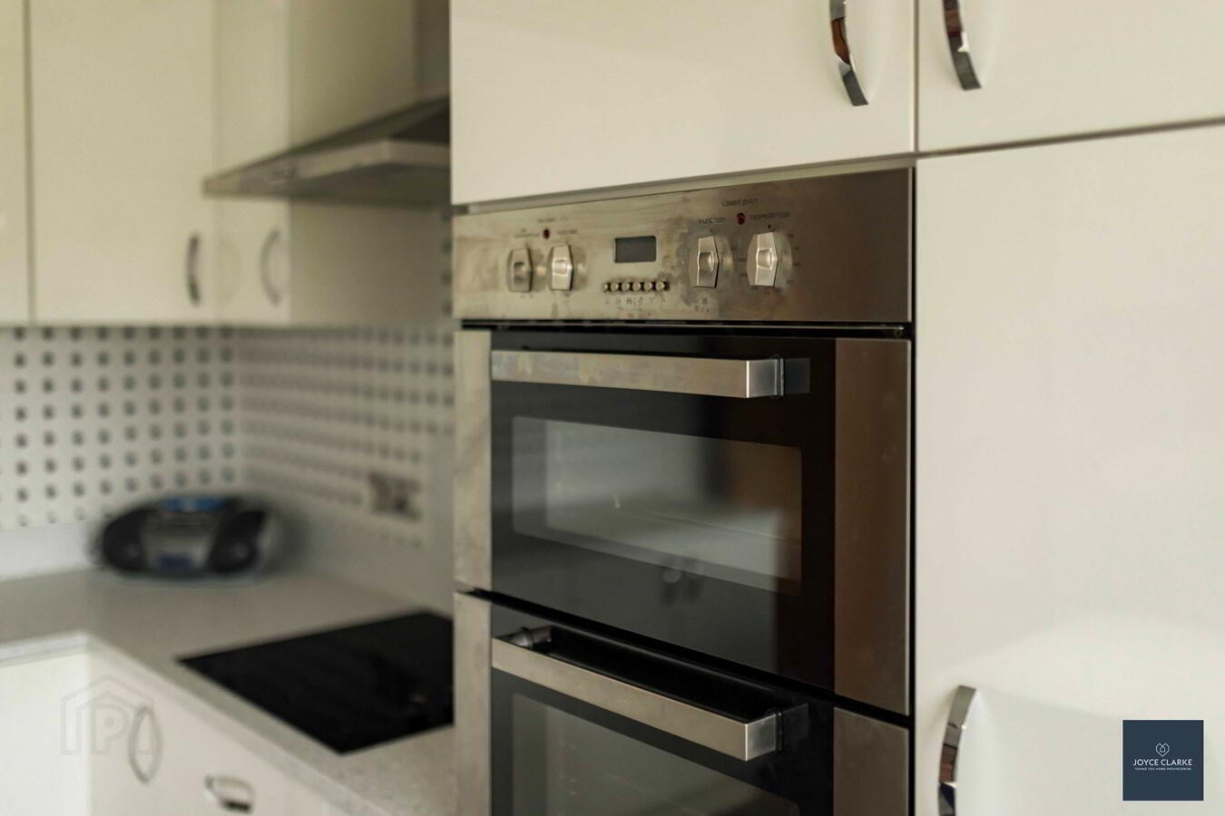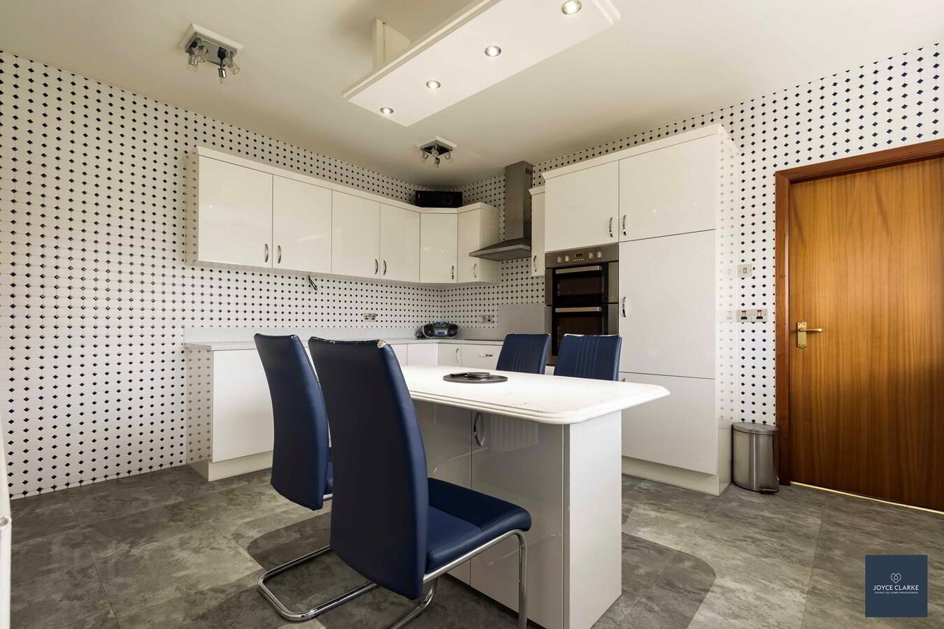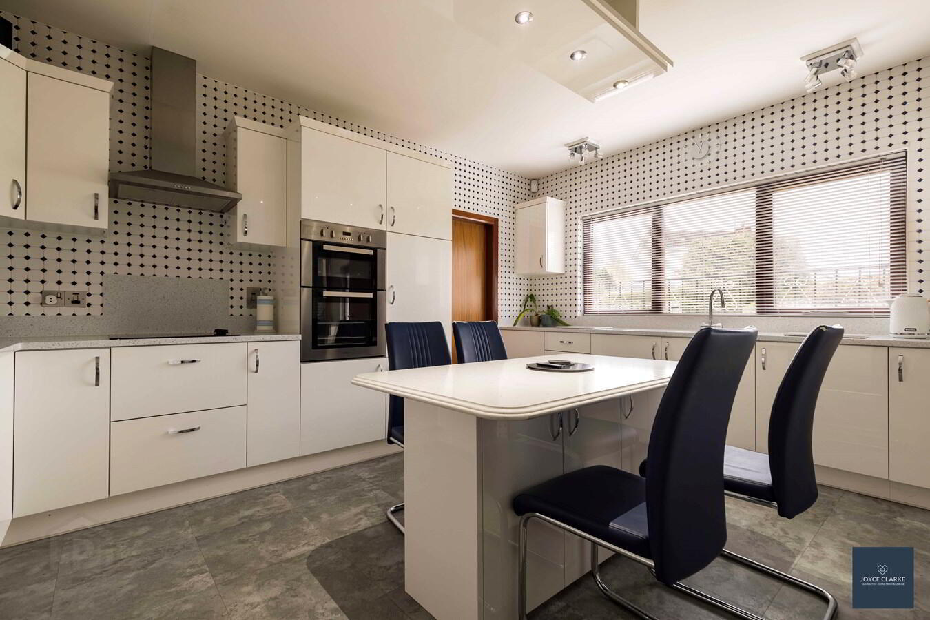 Excellent range of high and low level kitchen cabinets with modern white gloss slab doors, including saucepan drawers. Range of appliances include four ring electric hob with stainless steel extractor canopy above, double eye level oven and integrated fridge. Underfitted one and half bowl sink and drainage unit with mixer tap. Central island table with stone top, storage units below and lighting pelmet above with remote control. Double panel radiator. Tiled flooring. Tile effect laminate flooring.