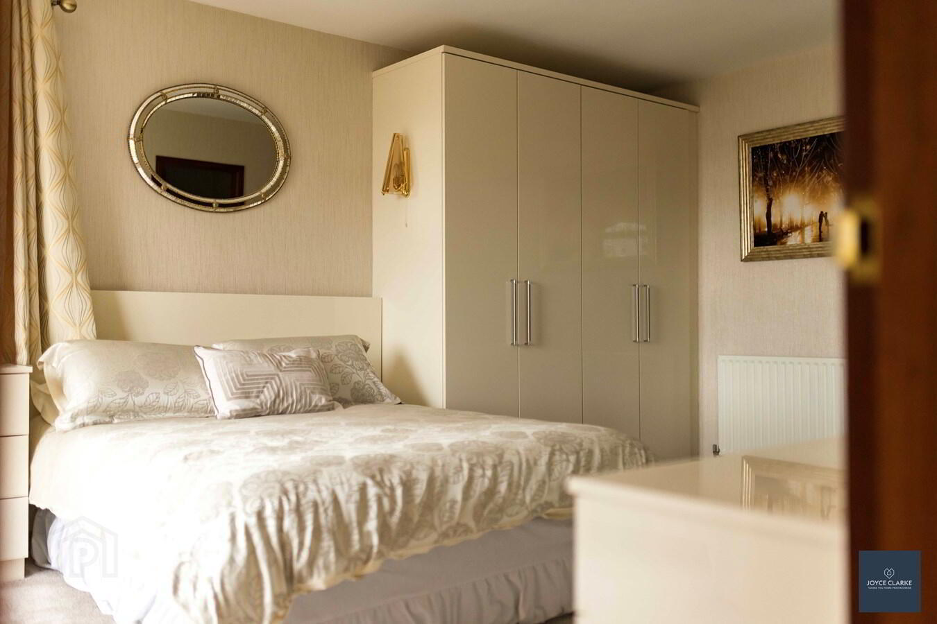 Front aspect double bedroom. Range of fitted bedroom furniture including set of drawers and cabinets and four door wardrobe with range of clothes rails and shelving. Single panel radiator and low level double panel radiator.