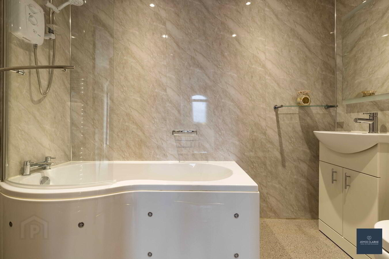 Three piece suite comprising of P shaped bath with electric shower and shower screen above, back to wall dual flush WC and wash hand basin with vanity unit below. Heated towel rail. PVC panel walls and ceiling. Recessed lighting. Extractor fan.