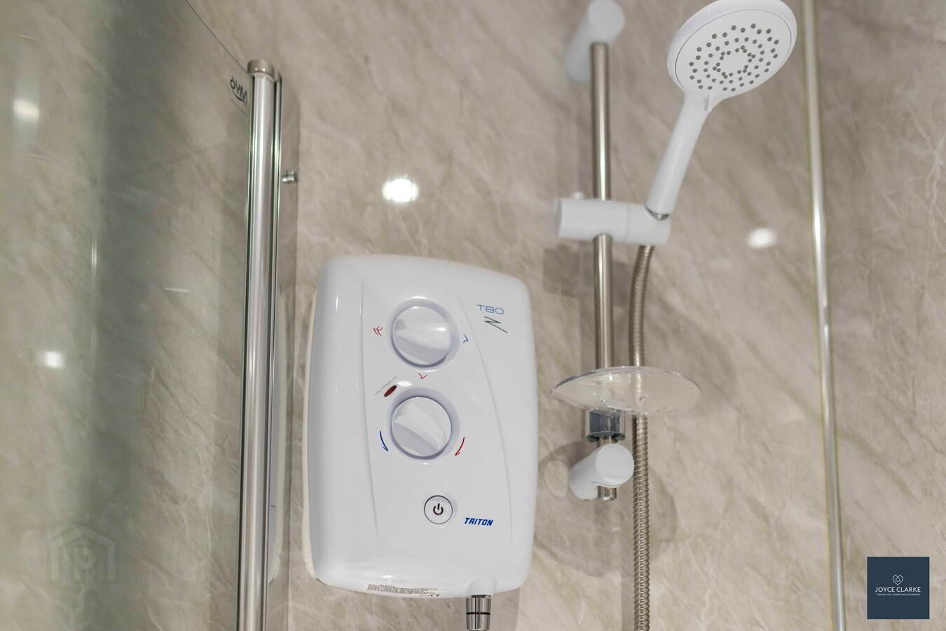 Large shower quadrant with mains fed shower and PVC panelling. Back to wall dual flush WC. Oversized wash hand basin with vanity unit below. Dual flush WC. Partial PVC and wall tiling. PVC panelled ceiling. Extractor fan.