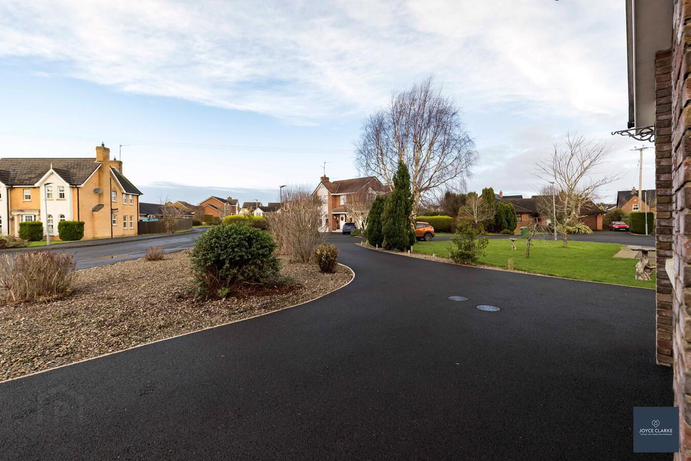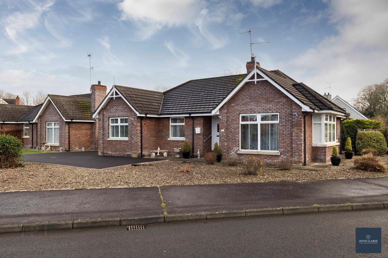 Spacious tarmac driveway approaching the property with parking to front and side. Front garden laid in decorative stone with mature planting.