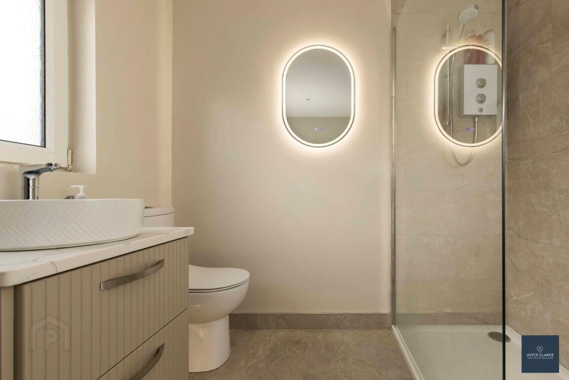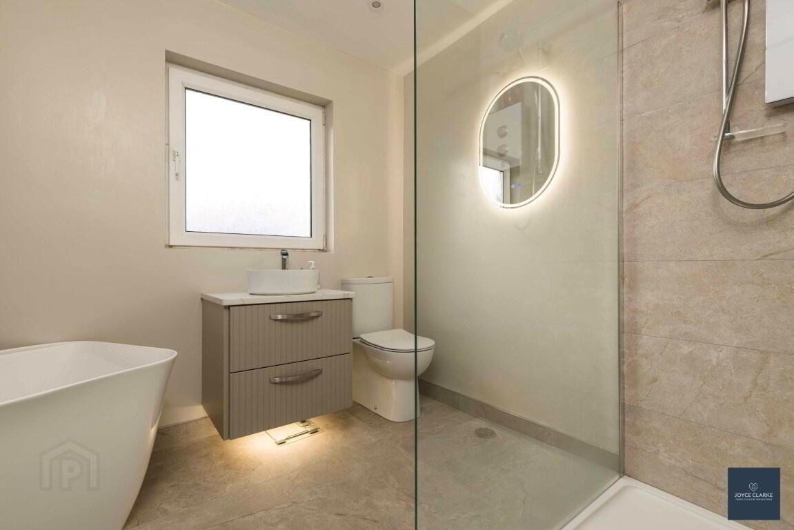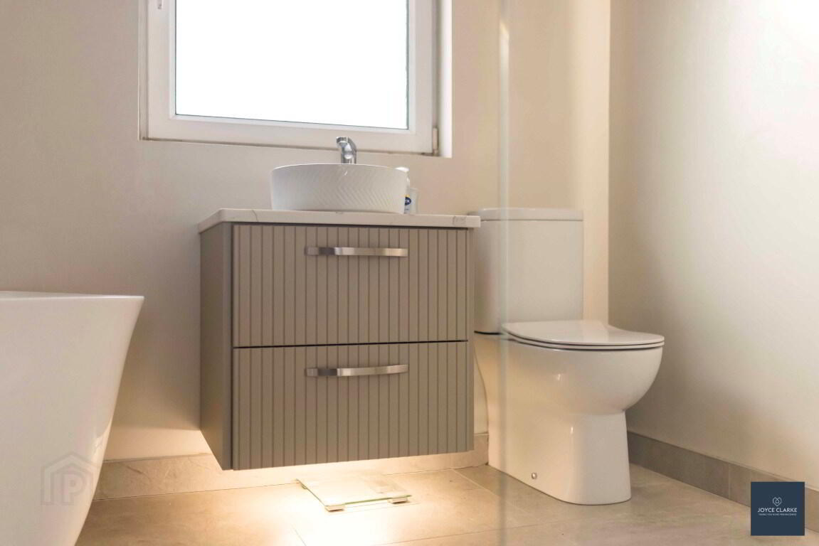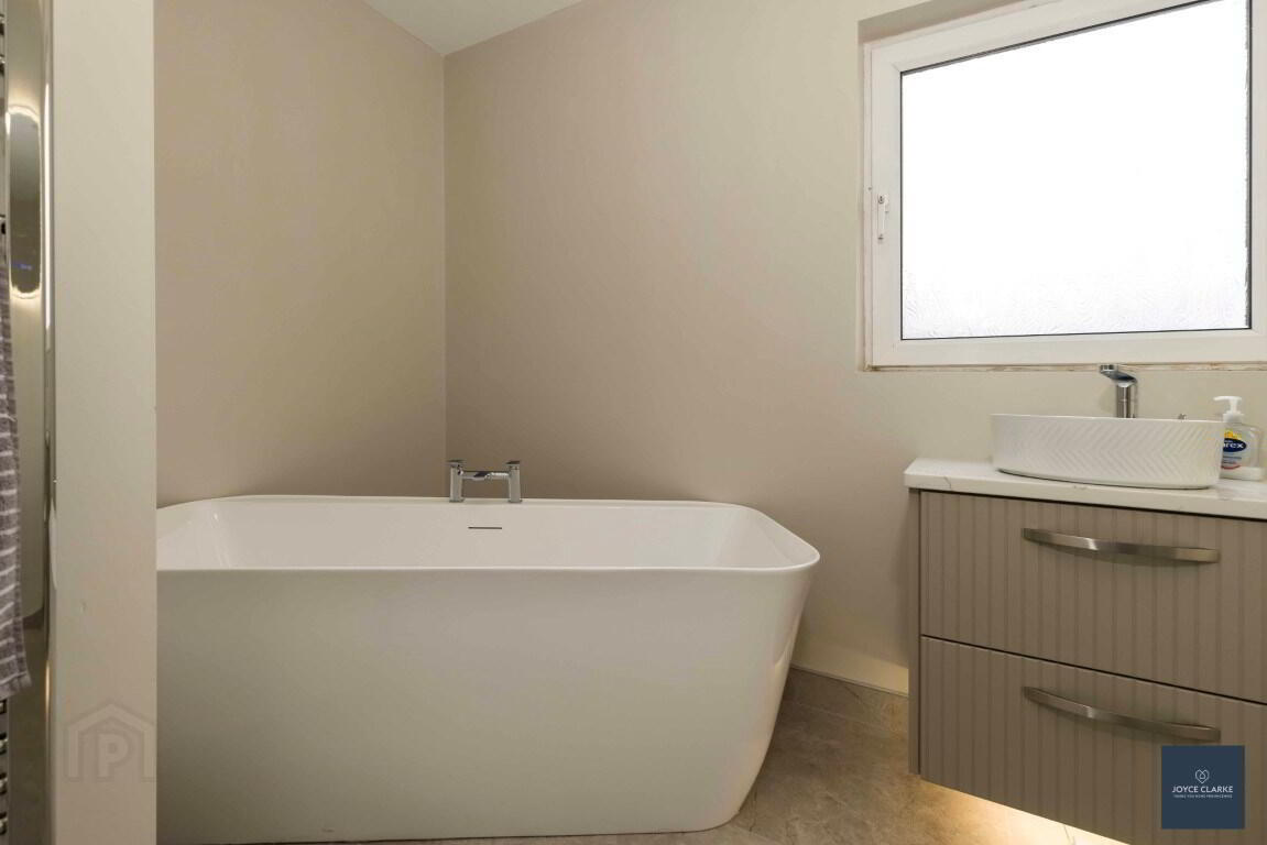 Stunning modern four piece suite comprising of rimless shower enclosure with electric power shower. Free standing bath with centre mixer tap. Circular basin with vanity unit and quartz worktop. Back to wall dual flush WC. Heated towel rail. Tiled flooring. Recessed lighting.