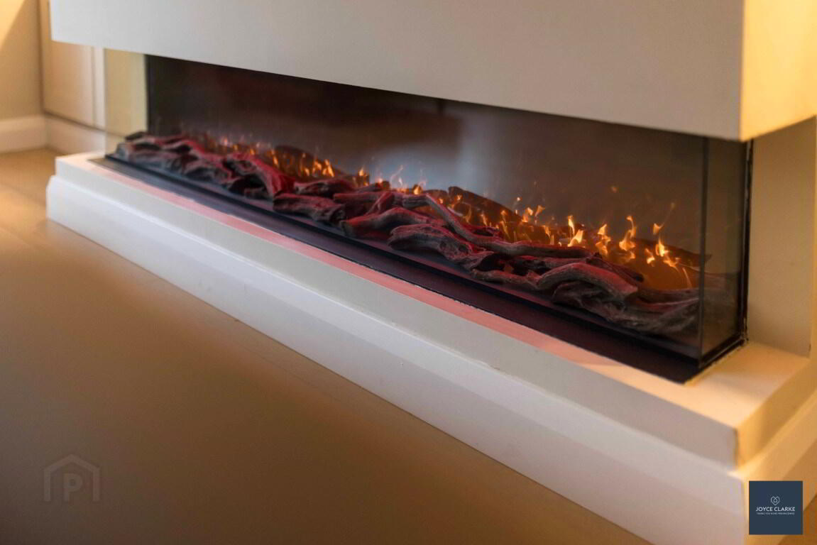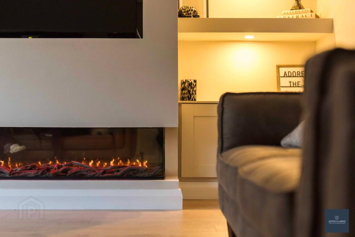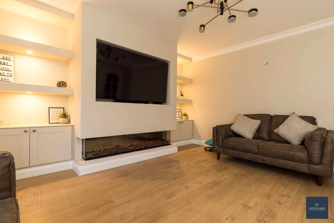 Feature media wall with electric fire inset. Bespoke shelving to each side with storage units. Bay window. Laminate flooring. Cornicing. Double panel radiator.