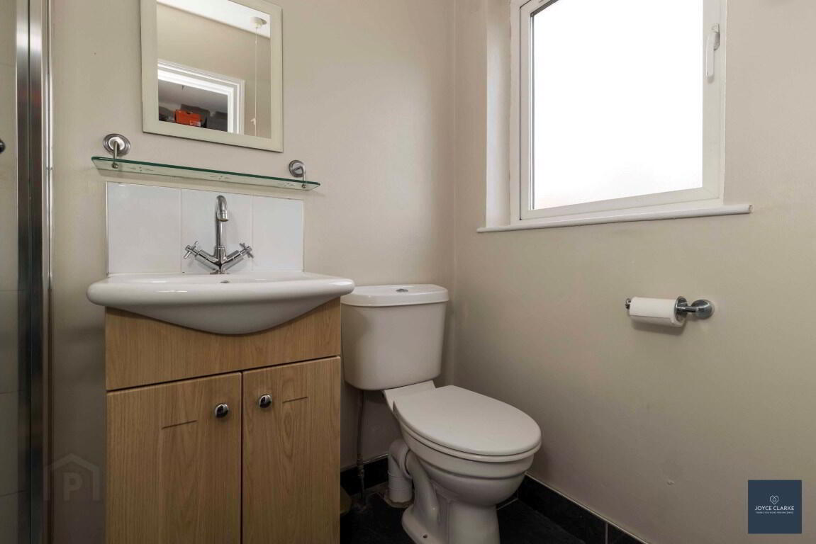 Corner shower with electric power shower. Sink with mixer tap and vanity. Dual flush WC. Tiled floor. Heated towel rail. Window. Recessed lighting.