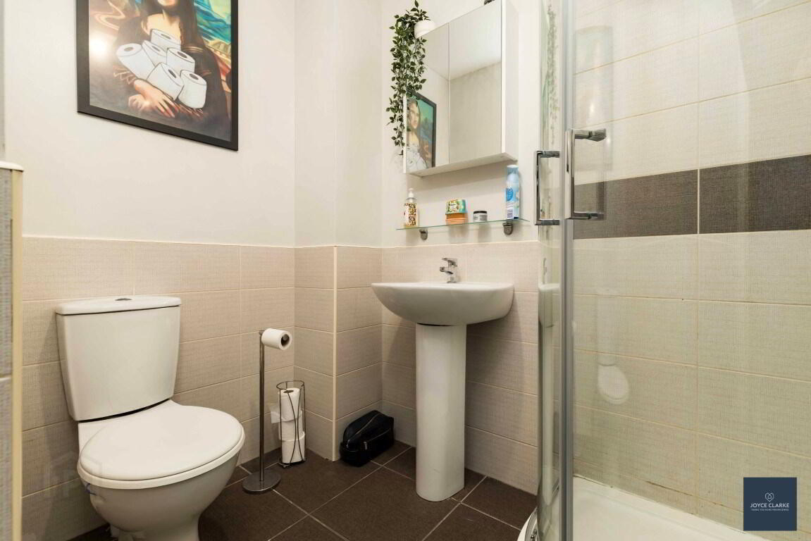Tiled shower enclosure with mains fed shower. Dual flush WC and wash hand basin with pedestal. Single panel radiator. Tiled flooring and half tiled walls. Extractor fan.