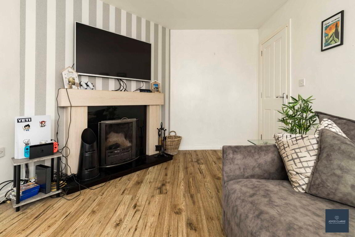 Front aspect reception room including feature open fireplace with stone surround and granite hearth. TV point for wall mounted TV. Wood effect laminate flooring. Double panel radiator.