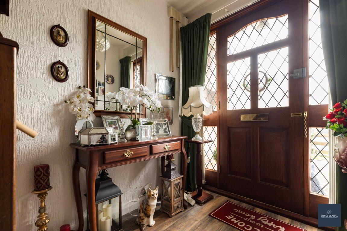Hardwood door with ornate glazed panels. Side glazed panels. Laminate flooring. Double panel radiator. Under stair storage. Thermostat.