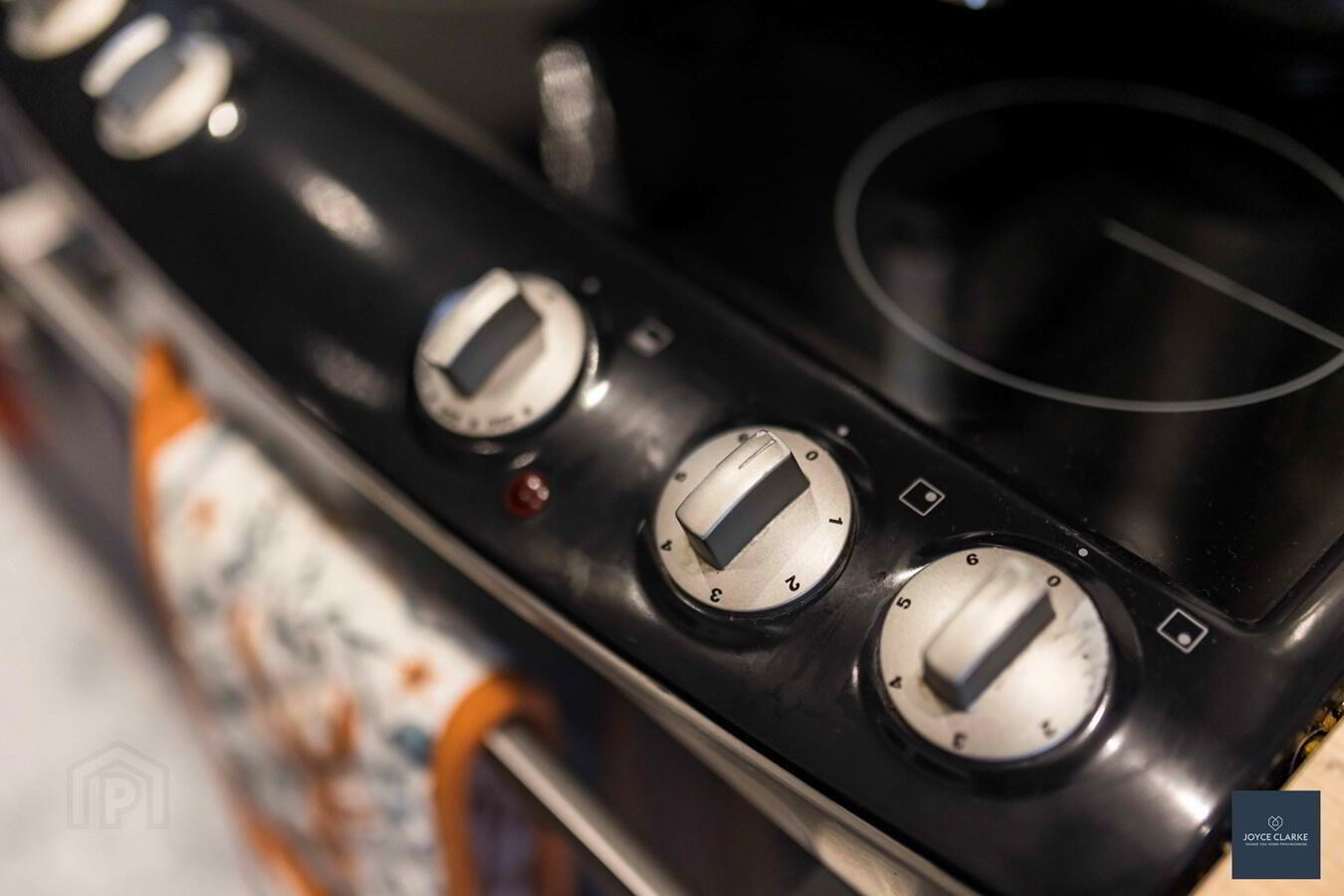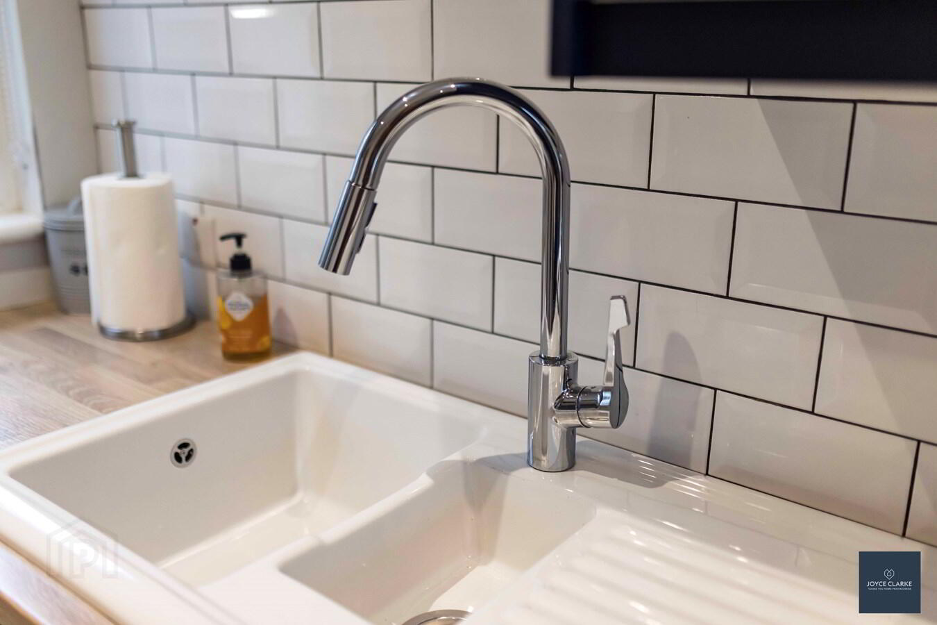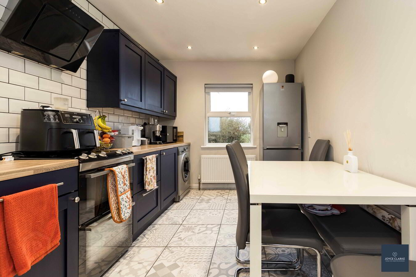 Dual aspect kitchen diner with UPVC stable style door giving access to rear. Range of high and low kitchen cabinets. Electric cooker with double oven and four ring hob with angled extractor hood. Ceramic one and half bowl sink and drainage unit with mixer tap. Space for washing machine and fridge freezer. Recessed lighting. Tiled flooring and splashback. Double panel radiator.