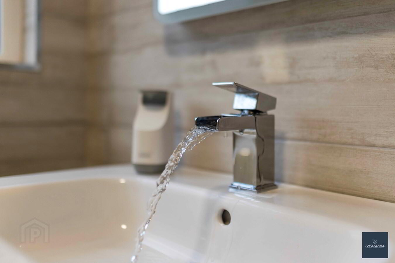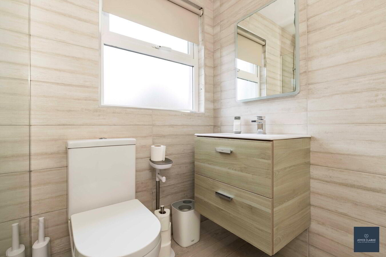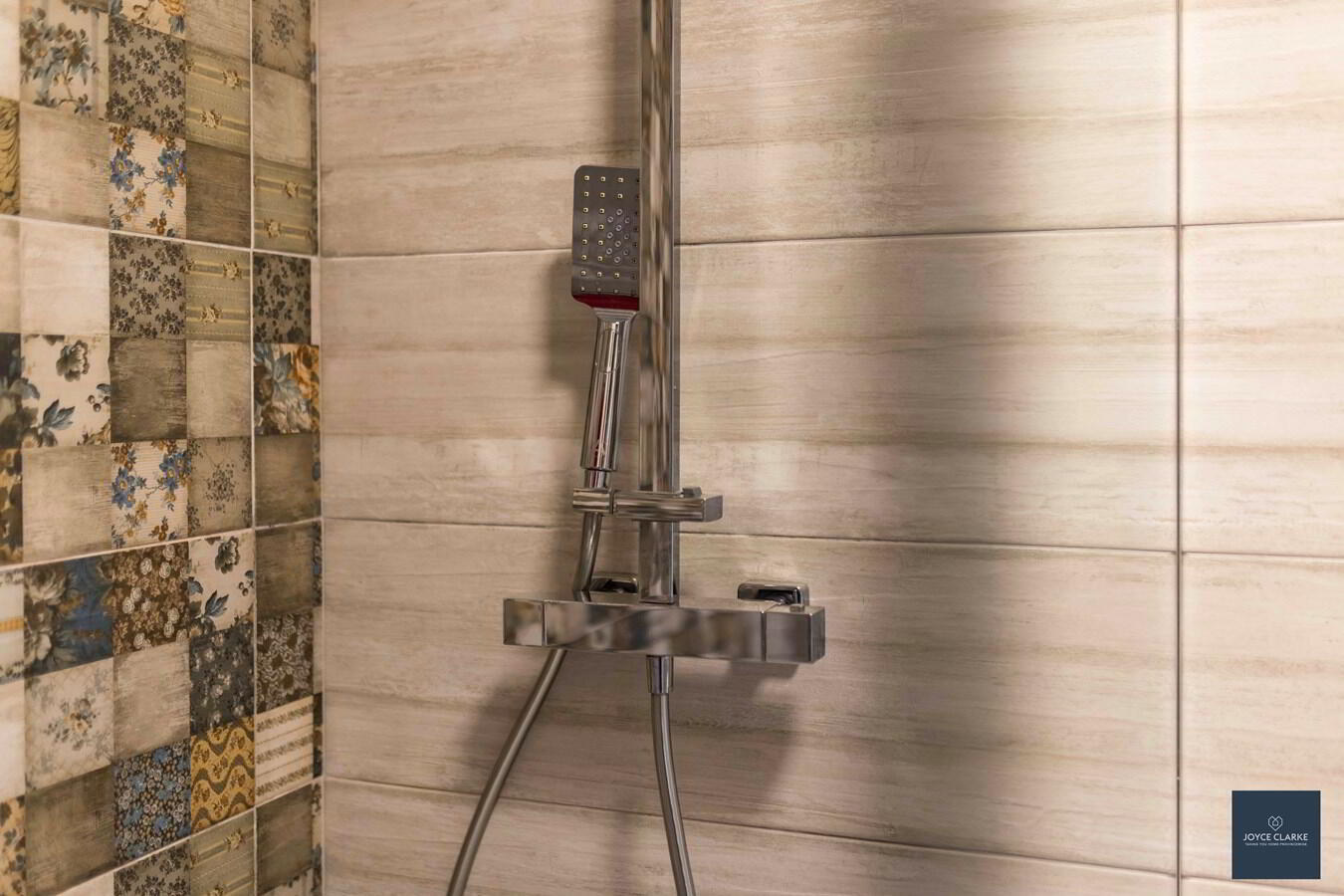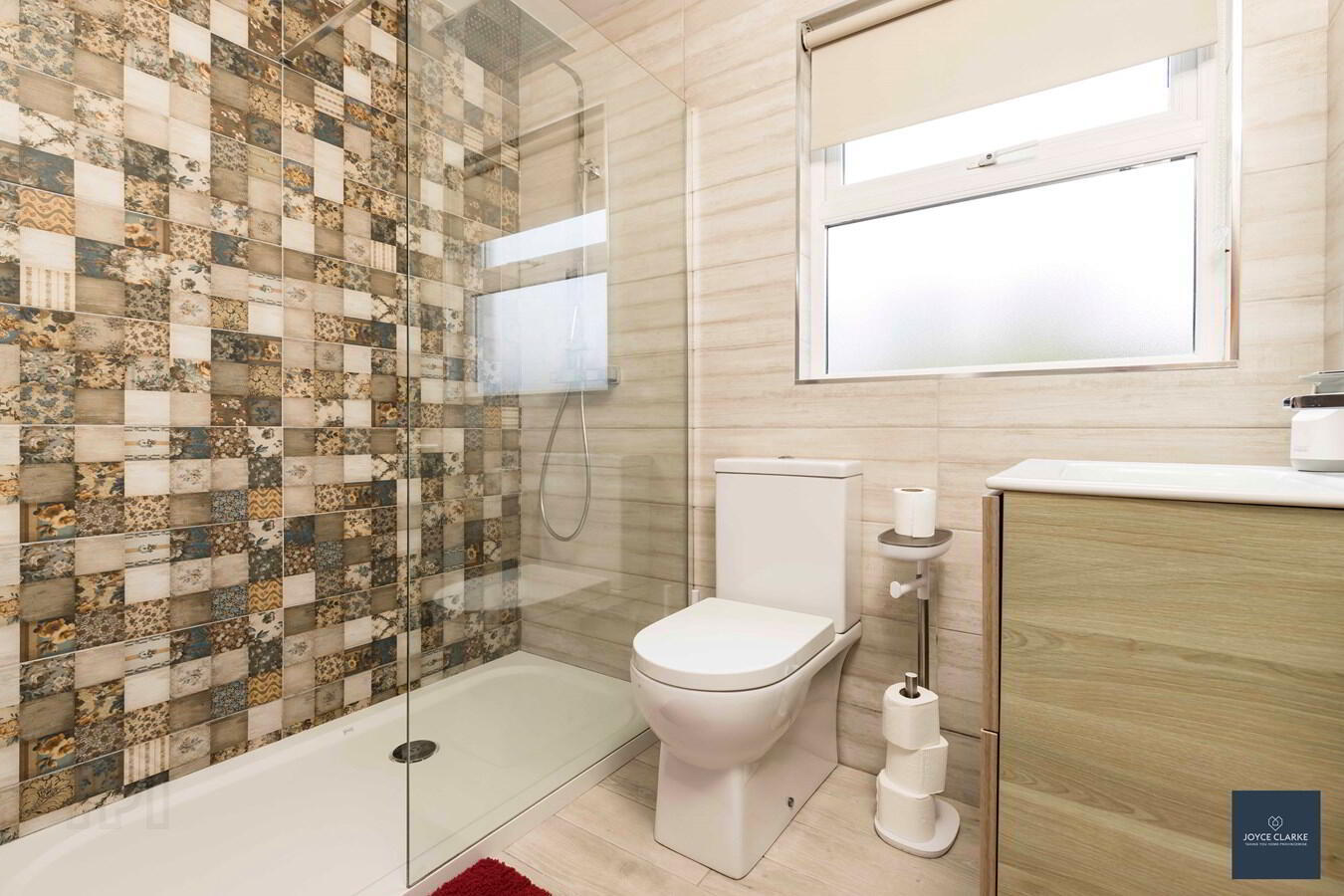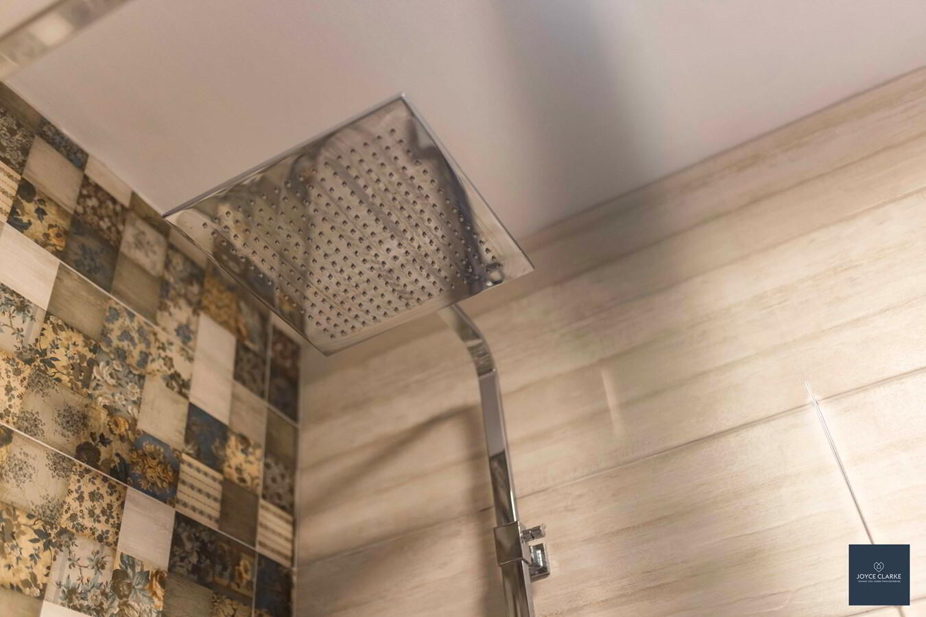 Fully tiled bathroom with large walk-in shower enclosure including mains fed rainfall showerhead and additional showerhead attachment. Back to wall dual flush WC and wall hung wash hand basin with vanity unit below. Electric heated mirror with lighting. Heated towel rail. Extractor fan.