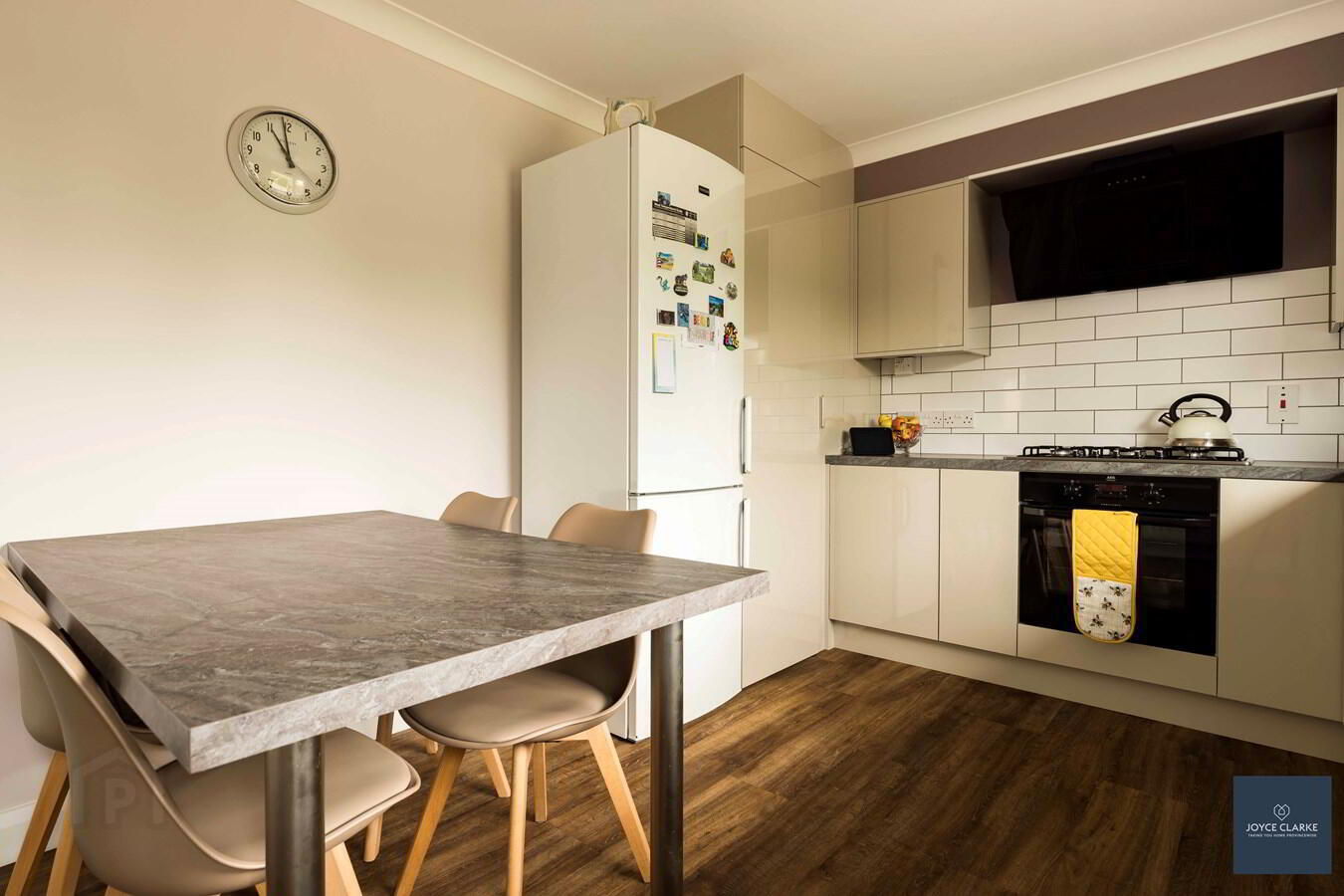 Range of modern, gloss high and low level kitchen cabinets including large larder style unit and doors with push open mechanism. Electric oven and five ring gas hob with angled extractor fan canopy above. Ceramic one and half bowl sink and drainage unit with mixer tap. Tiled splashback. Space for washing machine, dishwasher and fridge freezer. Wood effect LVP flooring. UPVC door with glazed panel giving access to rear garden.