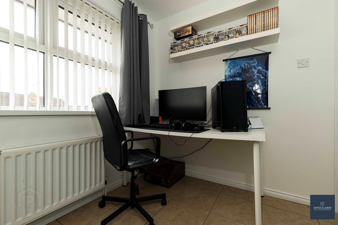 Rear aspect bedroom. Fitted double door wardrobe, desk / dresser with drawers. Double panel radiator. Tiled flooring.