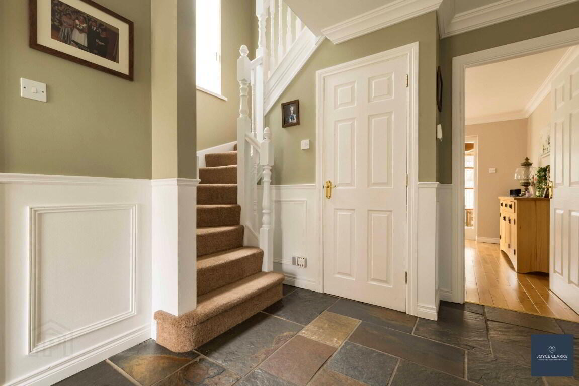 UPVC framed entrance door with glazed panels and glazed panels to either side. Cloakroom. Storage closet. Feature panelling to walls. Chinese slate tiled flooring. Alarm panel. Coving. Double panel radiator