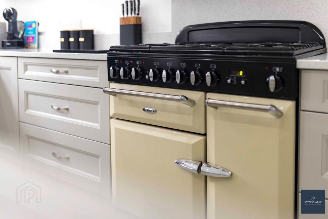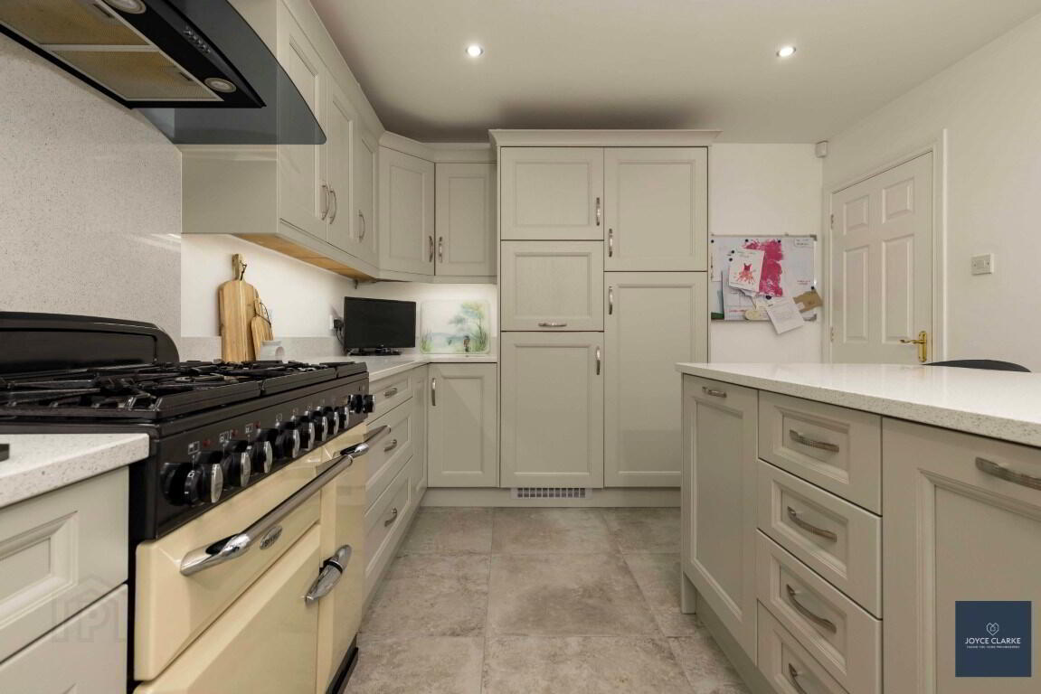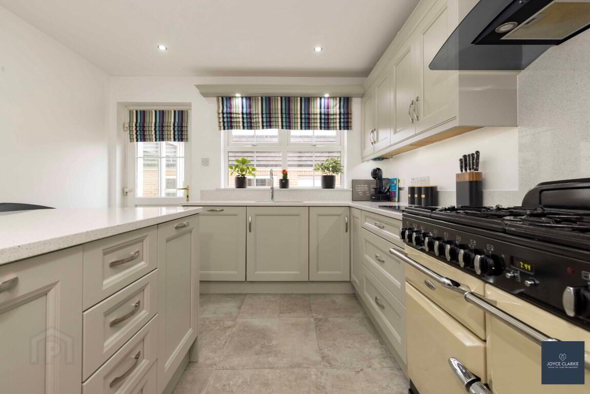 Excellent range of high and low level kitchen cabinets with solid wood doors including larder style unit, saucepan drawers, microwave cupboard and integrated pull-out bin storage. Range of appliances include Stanley range cooker with five ring gas hob, grill and double oven, integrated fridge and dishwasher. Stainless steel one and half bowl underfitted sink with Quooker tap and pelmet above with recessed lighting. Island unit with seating area. Quartz worktops, upstands and splashback to cooker area. Tiled flooring and skirting. Recessed lighting. Double panel radiator. UPVC door with glazed panels giving access to rear.
