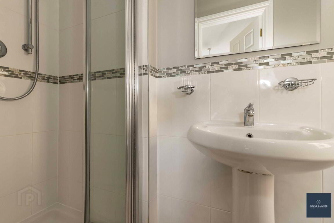 Tiled shower enclosure with mains fed shower. Dual flush WC and wash hand basin with pedestal. Half tiled walls and flooring tiling. Extractor fan. Single panel radiator.