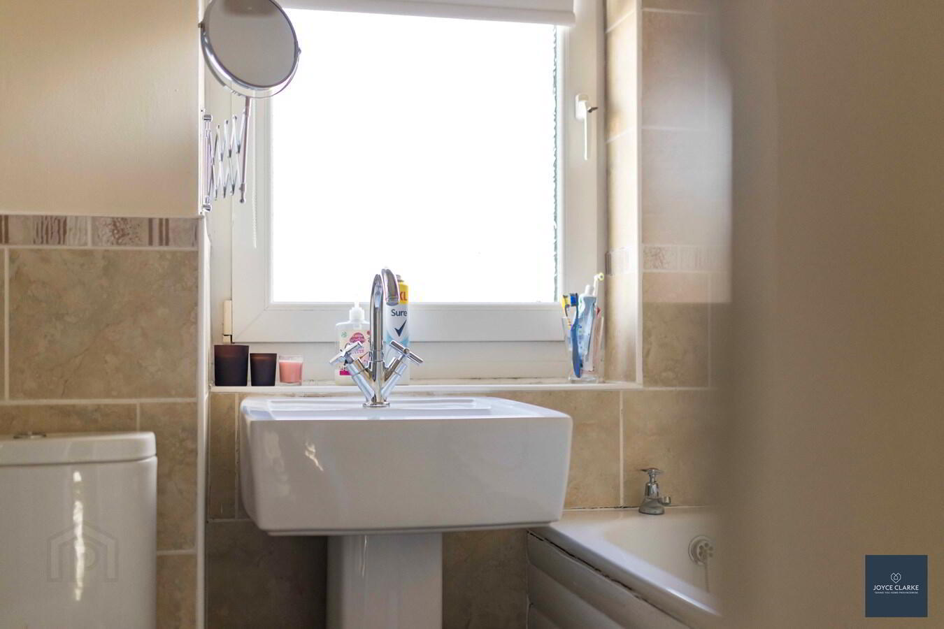 Three piece bathroom suite comprising of panel bath with electric shower and shower screen above, wash hand basin with pedestal and back to wall dual flush WC. Heated towel rail. Half tiled walls and additional wall tiling to walls around bath area.