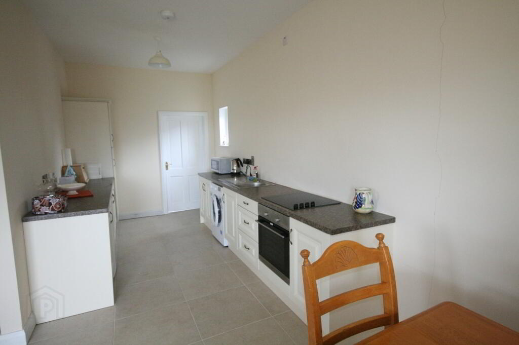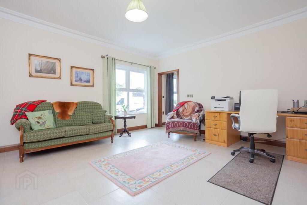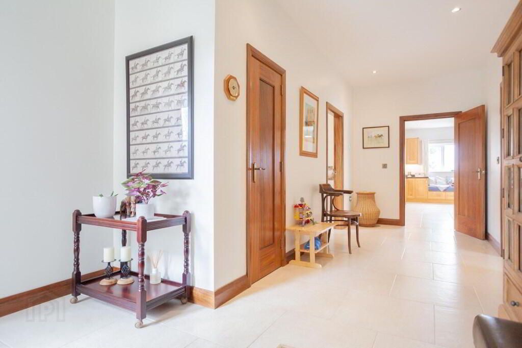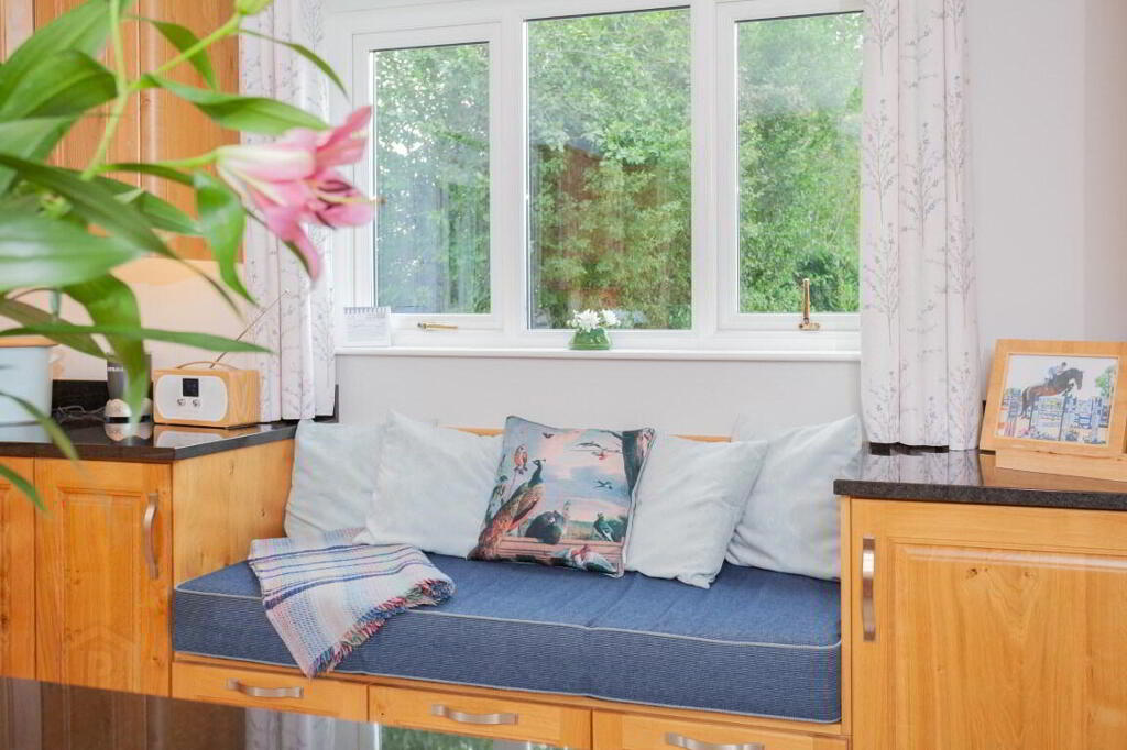 KITCHEN DINER 9.24m x 5.01m (30' 4" x 16' 5") (MAX) Daul aspect kitchen diner with excellent range of high and low level kitchen cabinets with solid Oak doors, display cabinets with glazed panels, larder style unit, under unit lighting, island with seating area and integrated seating area. Range of appliances include electric oven, four ring electric hob with integrated extractor above, integrated microwave, dishwasher, full height fridge and freezer. Oil fired Rayburn range cooker. Granite worktops. Underfitted one and half bowl sink with mixer tap. Recessed lighting with additional ceiling roses. Walk-in storage closet. UPVC double patio doors giving access to rear. Tiled flooring.