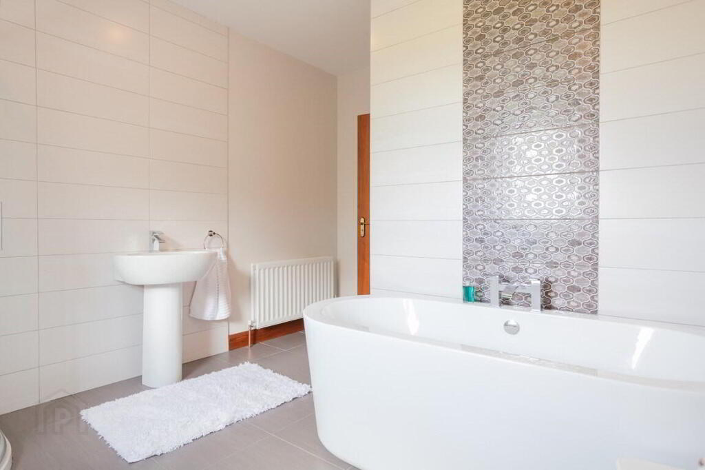 FAMILY BATHROOM 3.01m x 3.73m (9' 11" x 12' 3") Bathroom suite comprising of freestanding bath with centre taps, back to wall WC and wash hand basin with pedestal. Separate tiled shower quadrant with mains fed shower. Tiled flooring and feature tiled walls to bath and wash hand basin areas. Double panel radiator. Recessed lighting. Extractor fan.