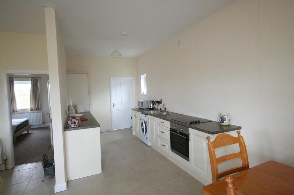 KITCHEN DINING LIVING ROOM 6.2m x 7.93m (20' 4" x 26' 0") Solid wood entrance door with glazed panel. Open plan dual aspect room. Range of low level kitchen cabinets. Electric oven and four ring electric hob with extractor canopy above. Space for washing machine and low level fridge. Stainless steel sink and drainage unit. Tiled flooring. TV point.