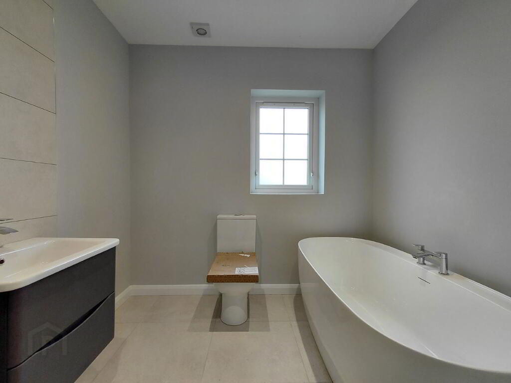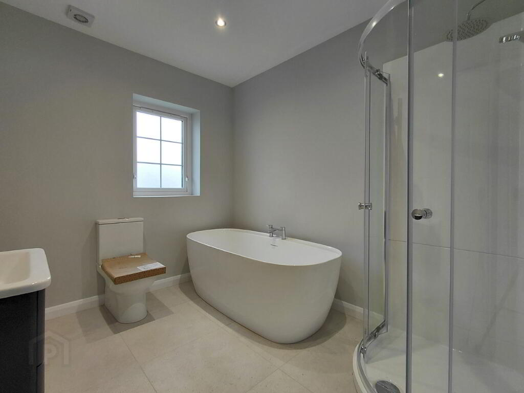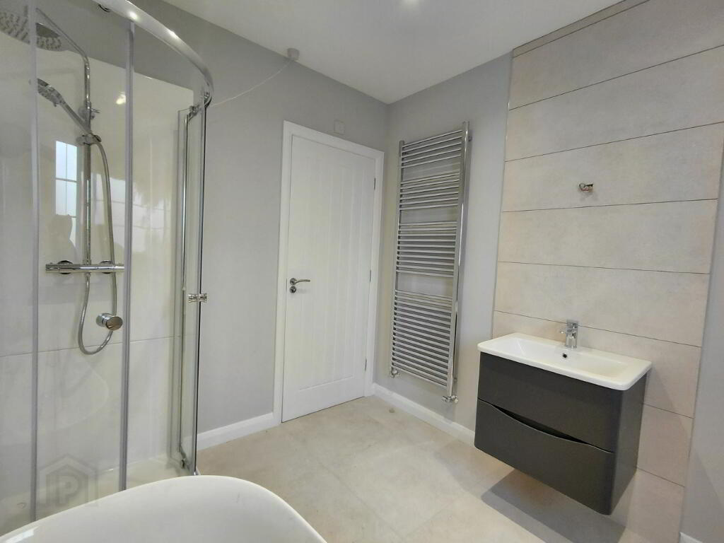 - Family bathroom with freestanding bath, separate shower pod with rainfall showerhead, wash hand basin with vanity unit and heated towel rail