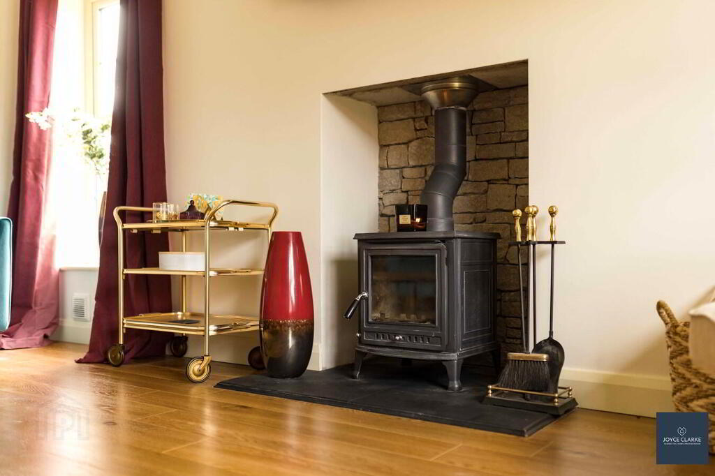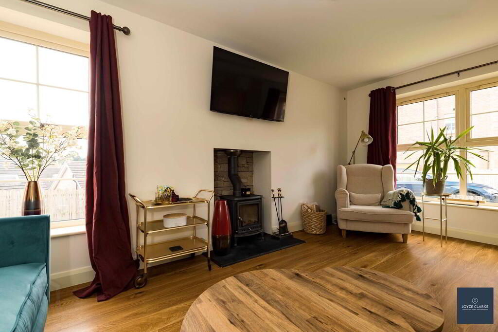LIVING ROOM 5.01m x 3.61m (16' 5" x 11' 10") Dual aspect reception room. Feature fireplace with multi-fuel stove and stone clad chamber. Laminate wooden flooring. Double panel radiator.