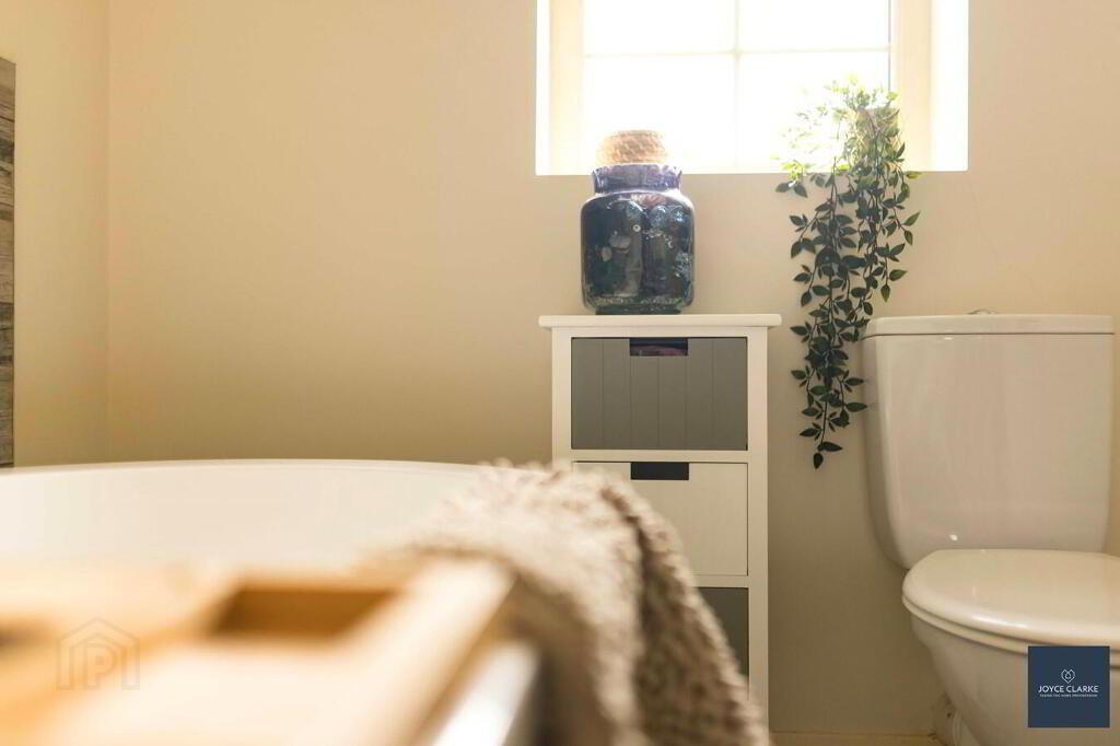 BATHROOM 2.46m x 2.06m (8' 1" x 6' 9") Beautiful, modern three piece bathroom suite comprising of freestanding bath with centre taps, dual flush WC and floating sink with tiled splashback. Tiled flooring. Partially tiled walls. Window. Extractor fan.