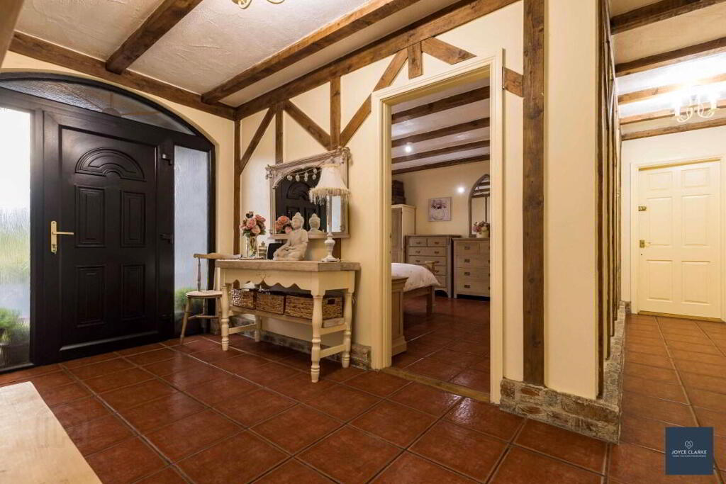 ENTRANCE HALL Entrance door with glazed panels to each side leading to hallway. Feature beam work. Tiled floor. Double panel radiator. Storage closet. Hotpress. Single panel radiator.