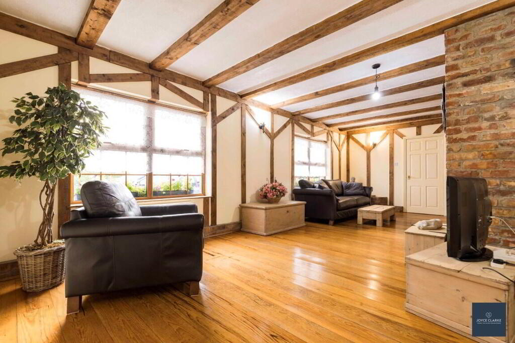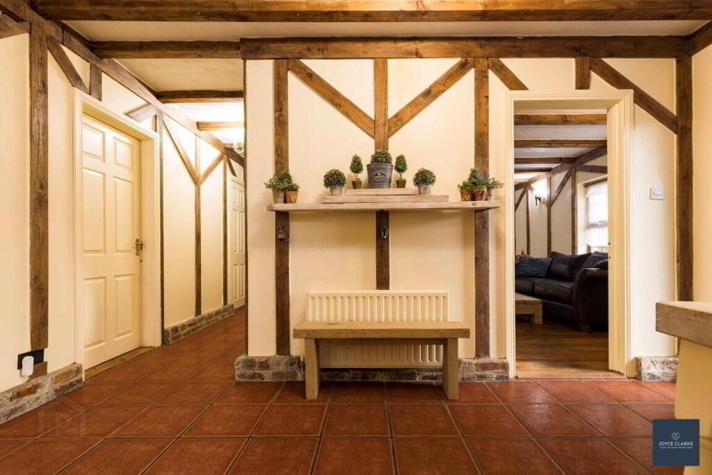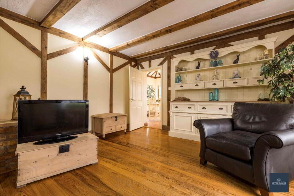 LIVING ROOM 4.17m x 8.05m (13' 8" x 26' 5") (MAX) Beautifully designed brick fireplace and surround. Tiled hearth. Exposed beams to ceiling. Solid wood flooring. Two double panel radiators.