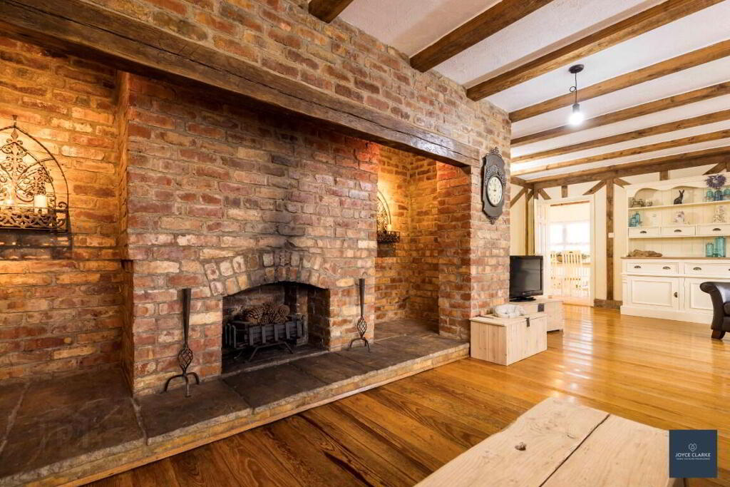 Beautiful living room with magnificent feature brick fireplace and attractive exposed ceiling beams