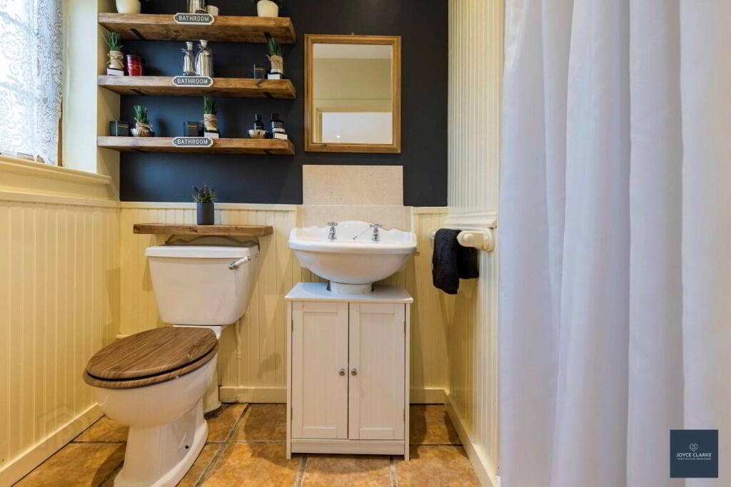 FAMILY BATHROOM 2.43m x 3.27m (8' 0" x 10' 9") Free standing cast iron bath with claw feet, cast iron taps. Pedestal style sink. WC .Shower enclosure with Redring electric shower. Exposed beams to ceiling. Double panel radiator. Tiled floor. Wall panelling. Window. Extractor.